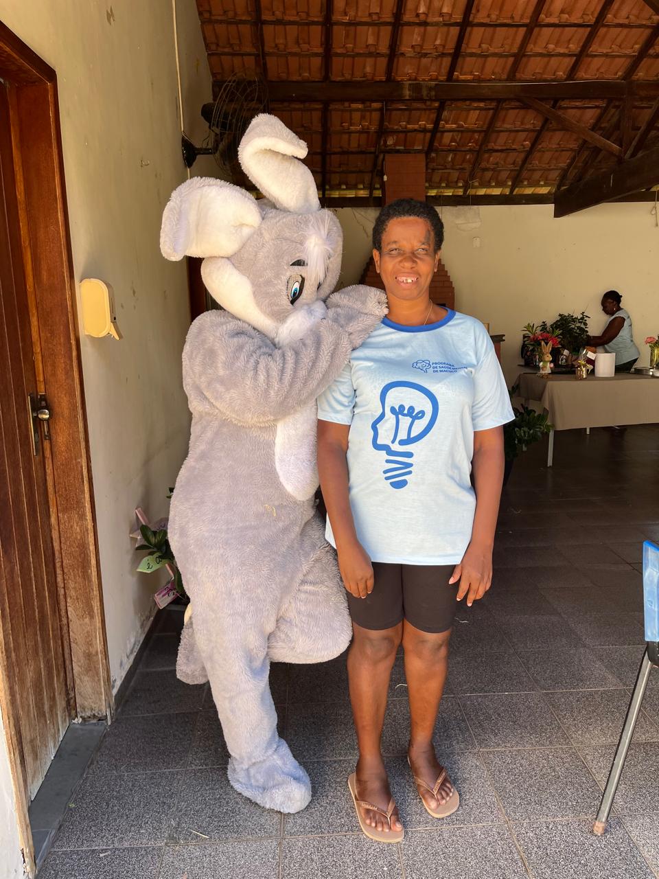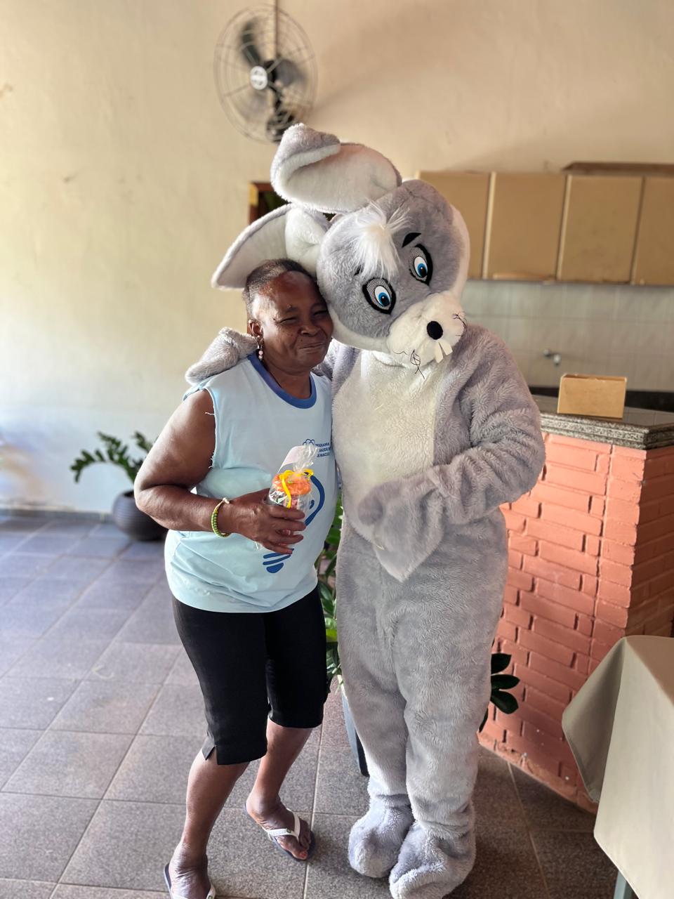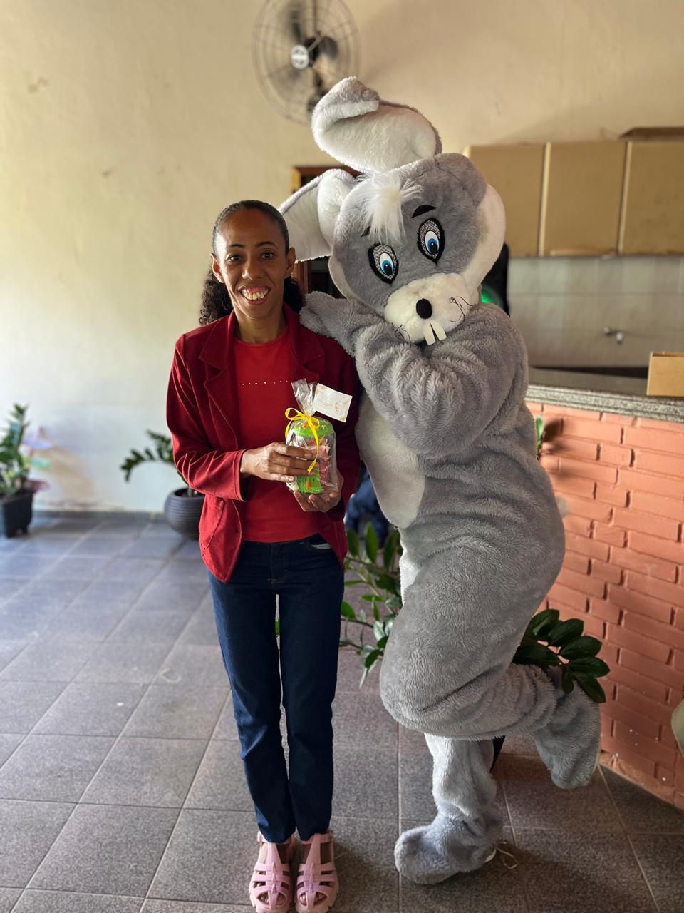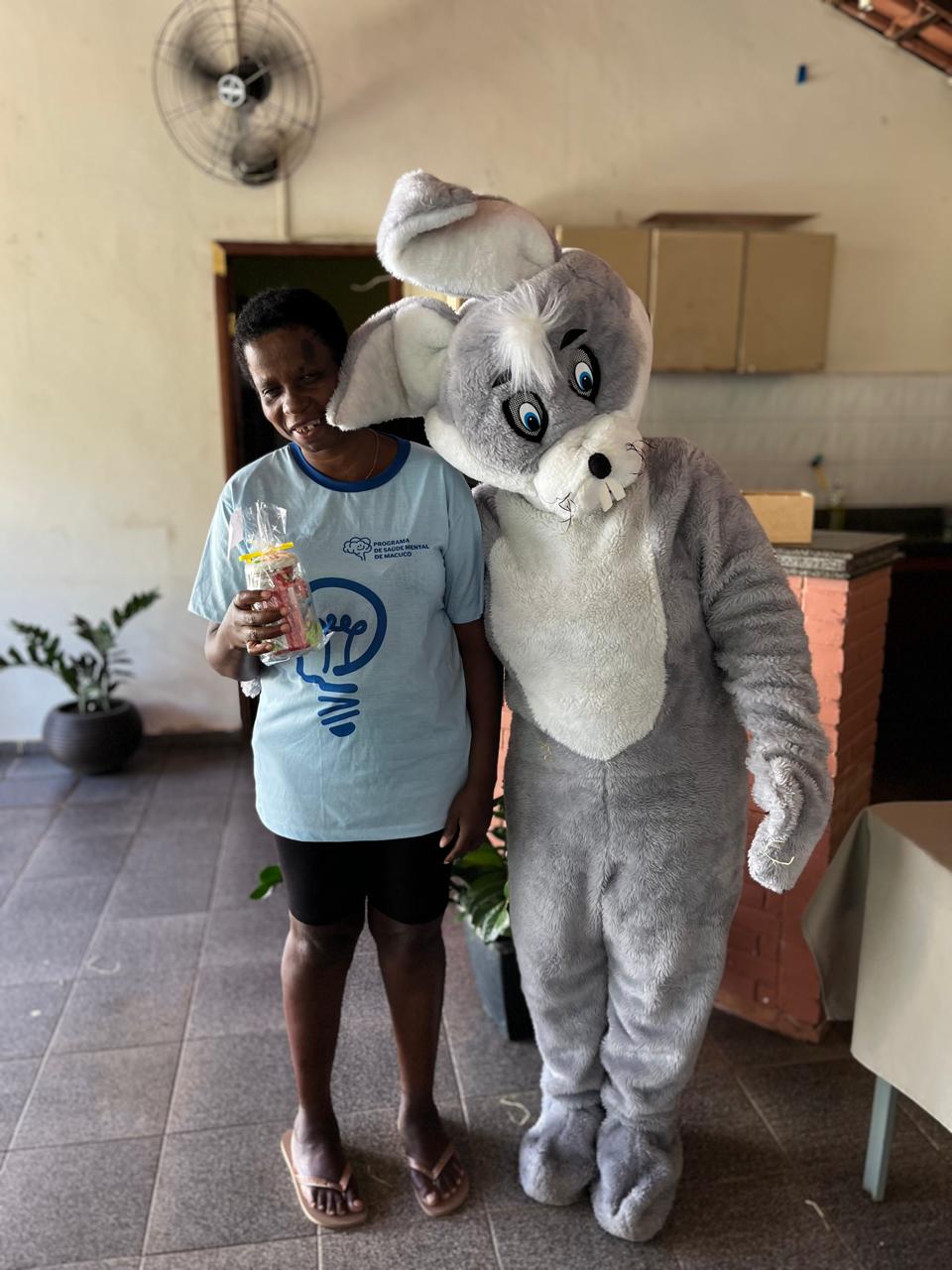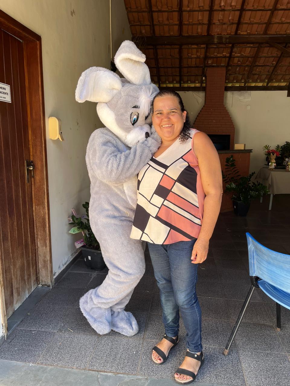 A secretária Ana Paula Gonçalves entrou no espírito da festa ao lado do coelhinho, trazendo ainda mais alegria para o dia dos os usuários do CAPS/Macuco