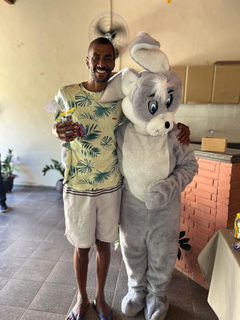 Um abraço do coelhinho que renova e exibe a alegria de celebrar a Páscoa no CAPS de Macuco estampada no rosto de cada usuário