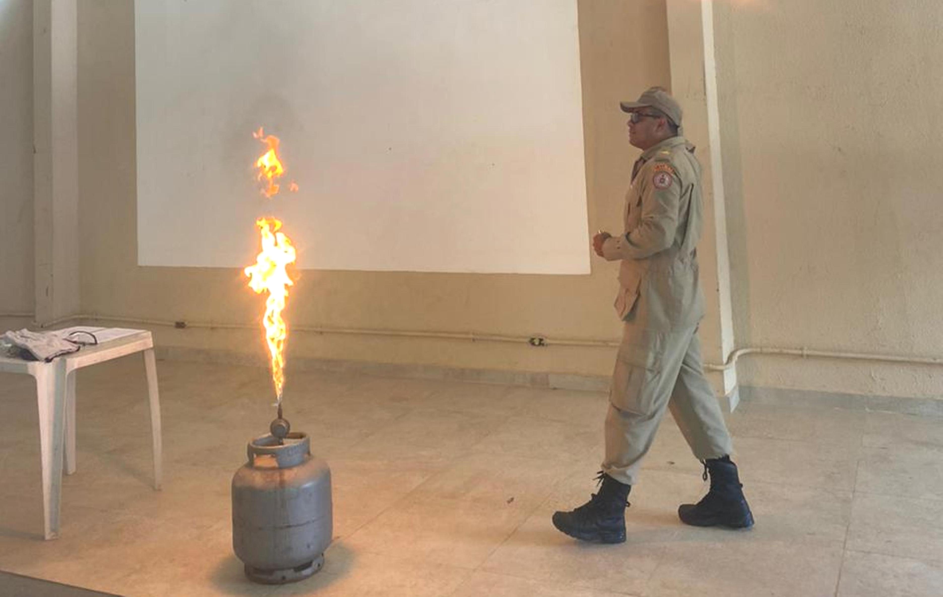 Num dos momentos da palestra, o Subtenente Walter mostrou como se deve lidar com possíveis incêndios provocados pelo gás de cozinha