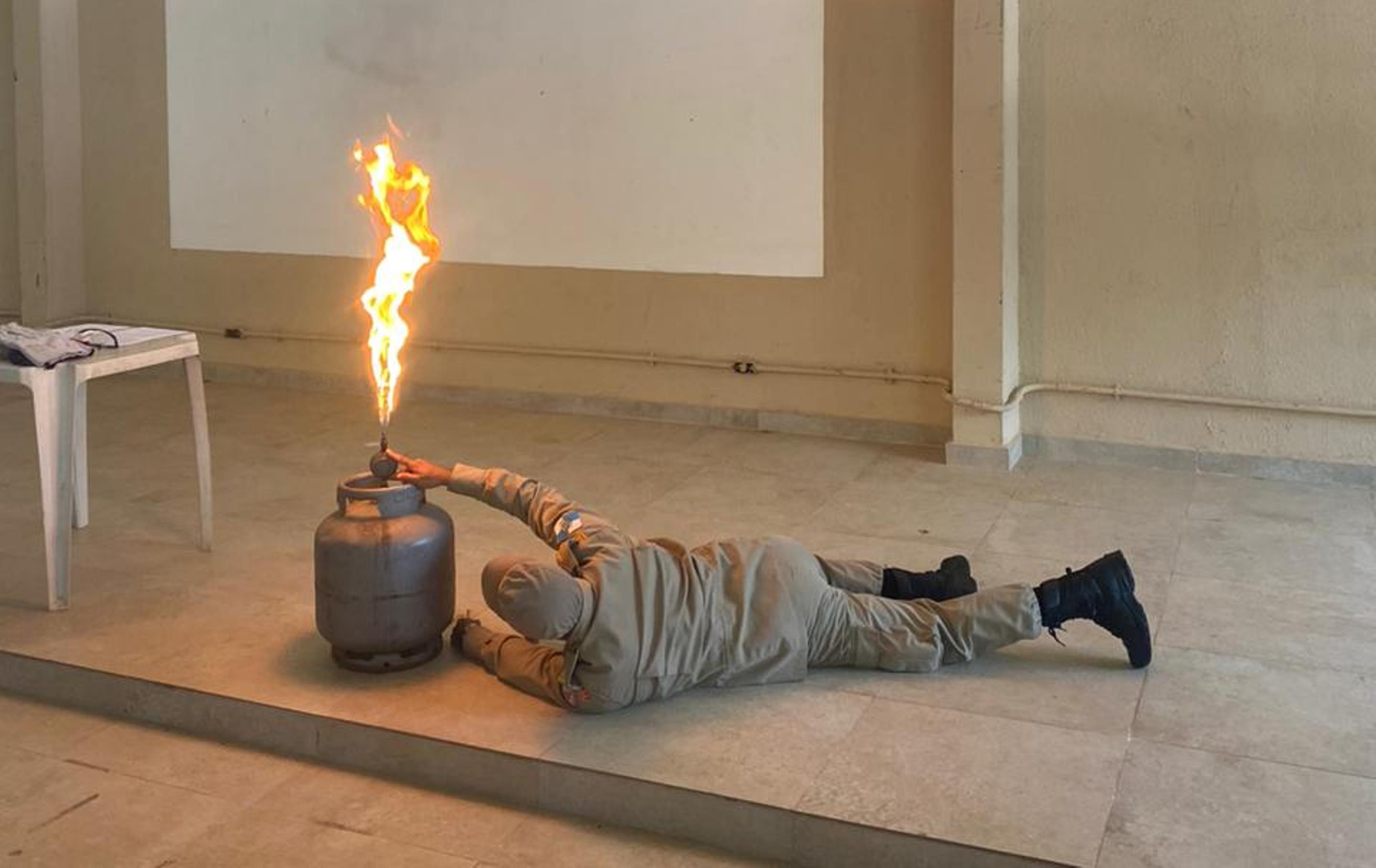 Subtenente Walter Almeida mostrando de maneira bastante didática como deve ser feita a interrupção do incêndio com GLP
