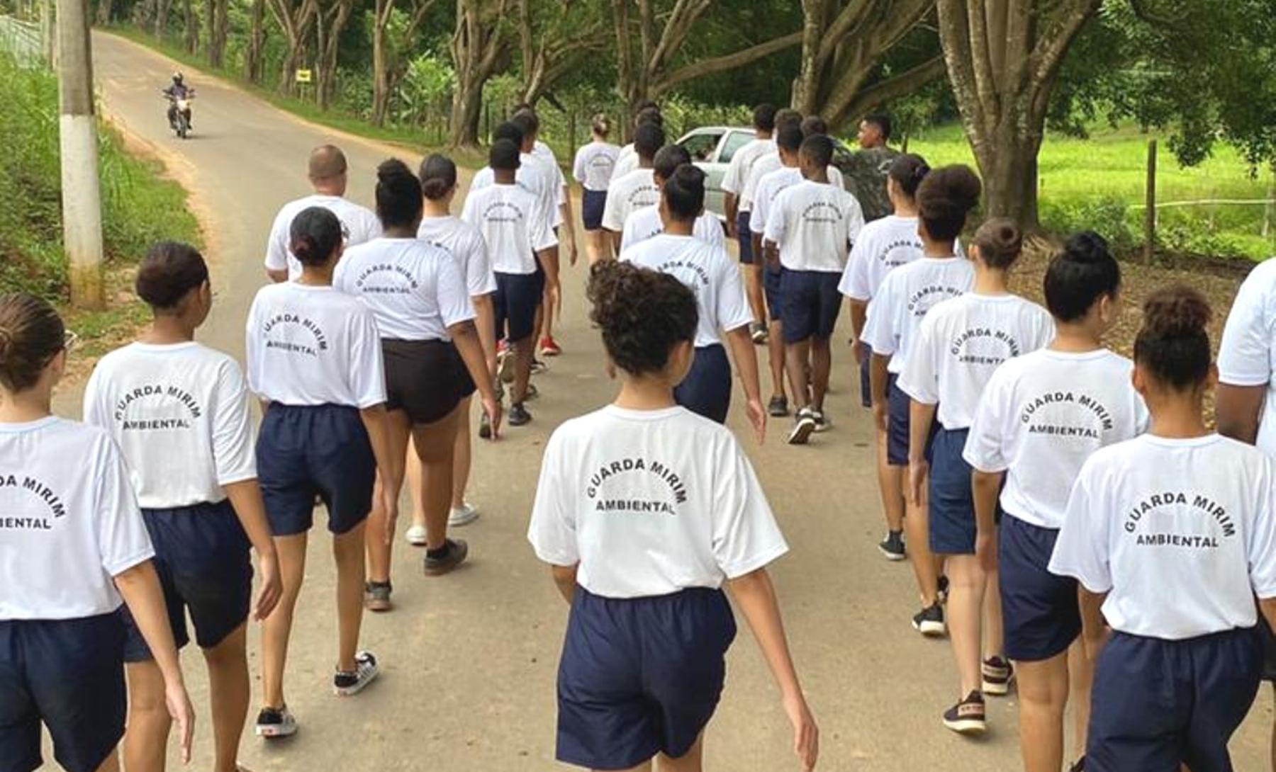 Servidor municipal Raul Carapeba à frente de meninas e meninos que participam da Guarda Mirim Ambiental