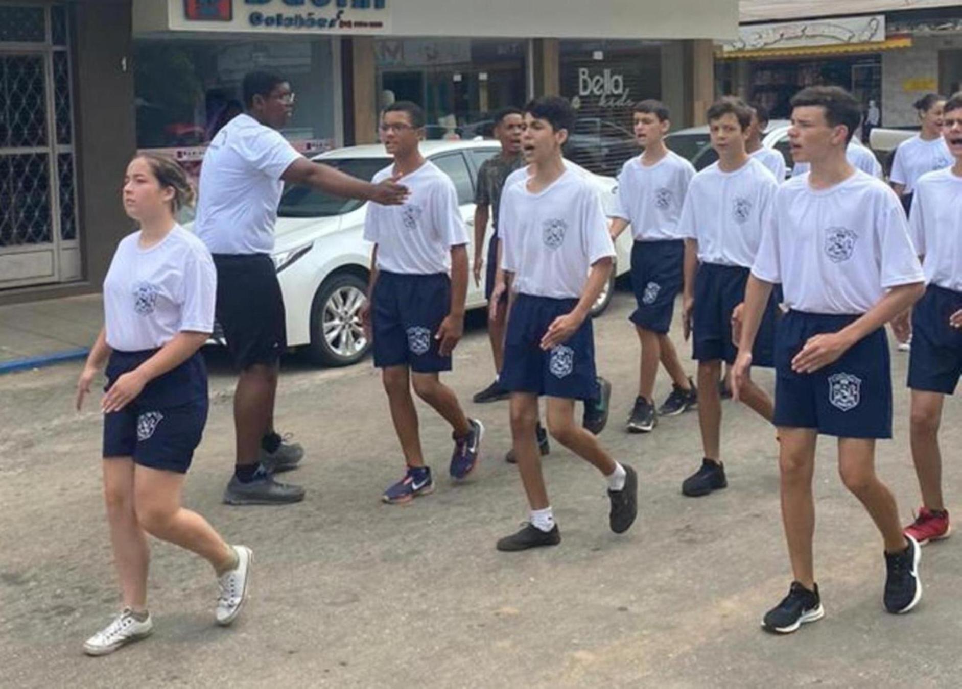 Marchando, meninas e meninos se dirigiram às ruas do centro de Macuco para um desfile na manhã de quarta-feira, dia 18