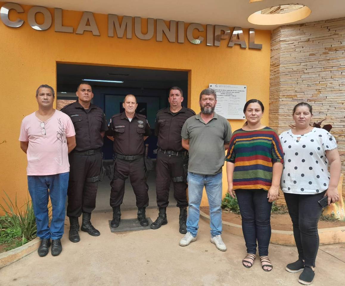 Equipes da Segurança Pública e do educandário municipal Sylvia Bath Rosas reunidos com alunos no pátio da escola