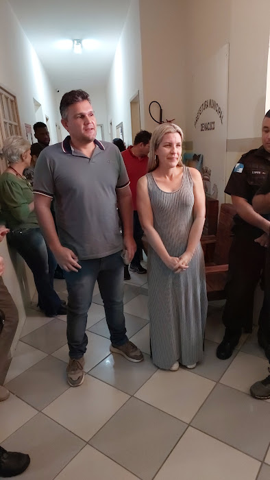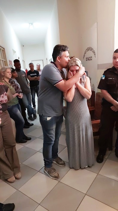 Prefeita Michelle Bianchini recebe o carinho do esposo João Vitor ao se emocionar durante o depoimento comovente sobre o saudoso pai