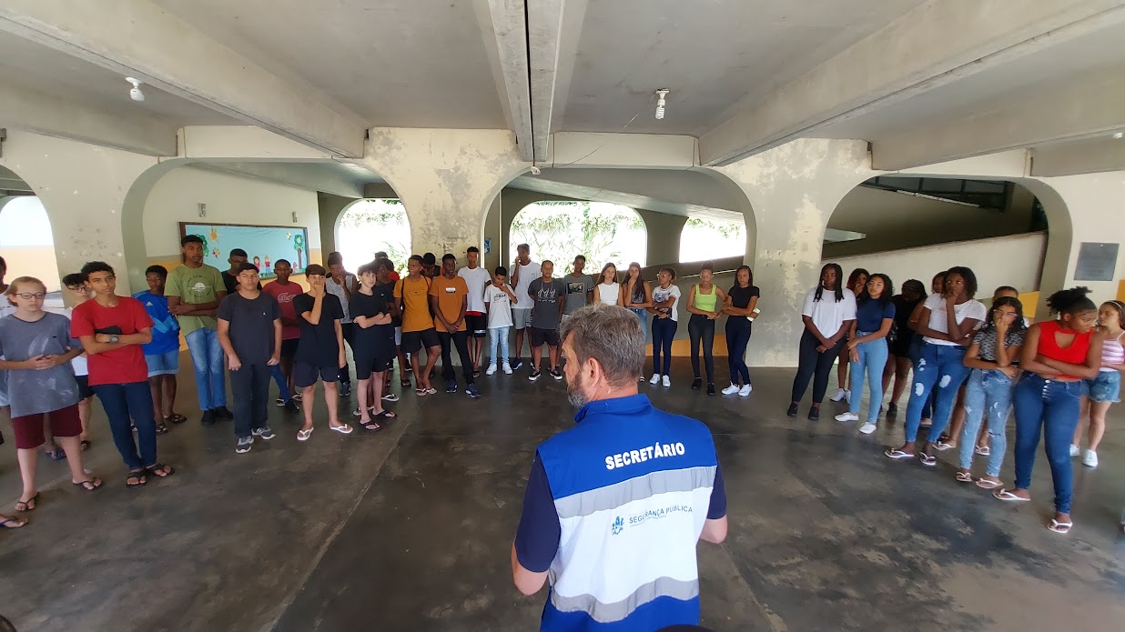 Reunidos no pátio do CIEP Honório Peçanha, os estudantes postulantes à Guarda Mirim ouvem as explicações do Capitão Bezerra