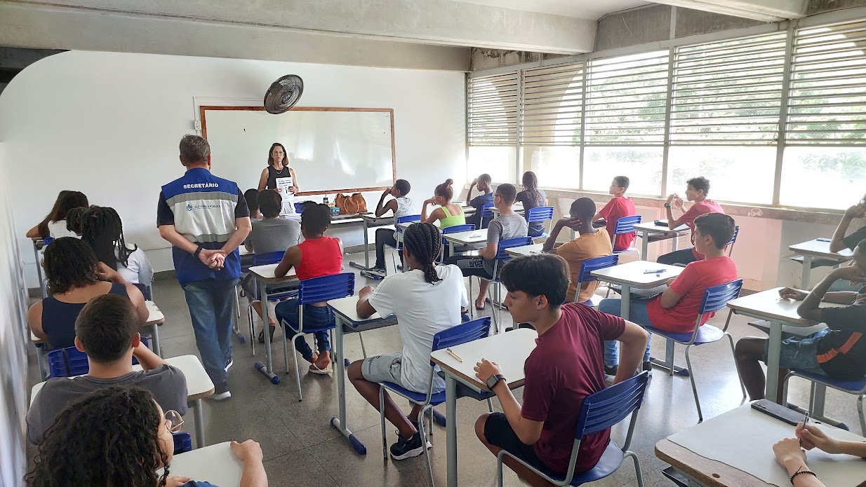 Já em sala de aula, Capitão Jocélio Bezerra e professora Cláudia Vogas, secretários de Segurança e Educação, conversam com os estudantes