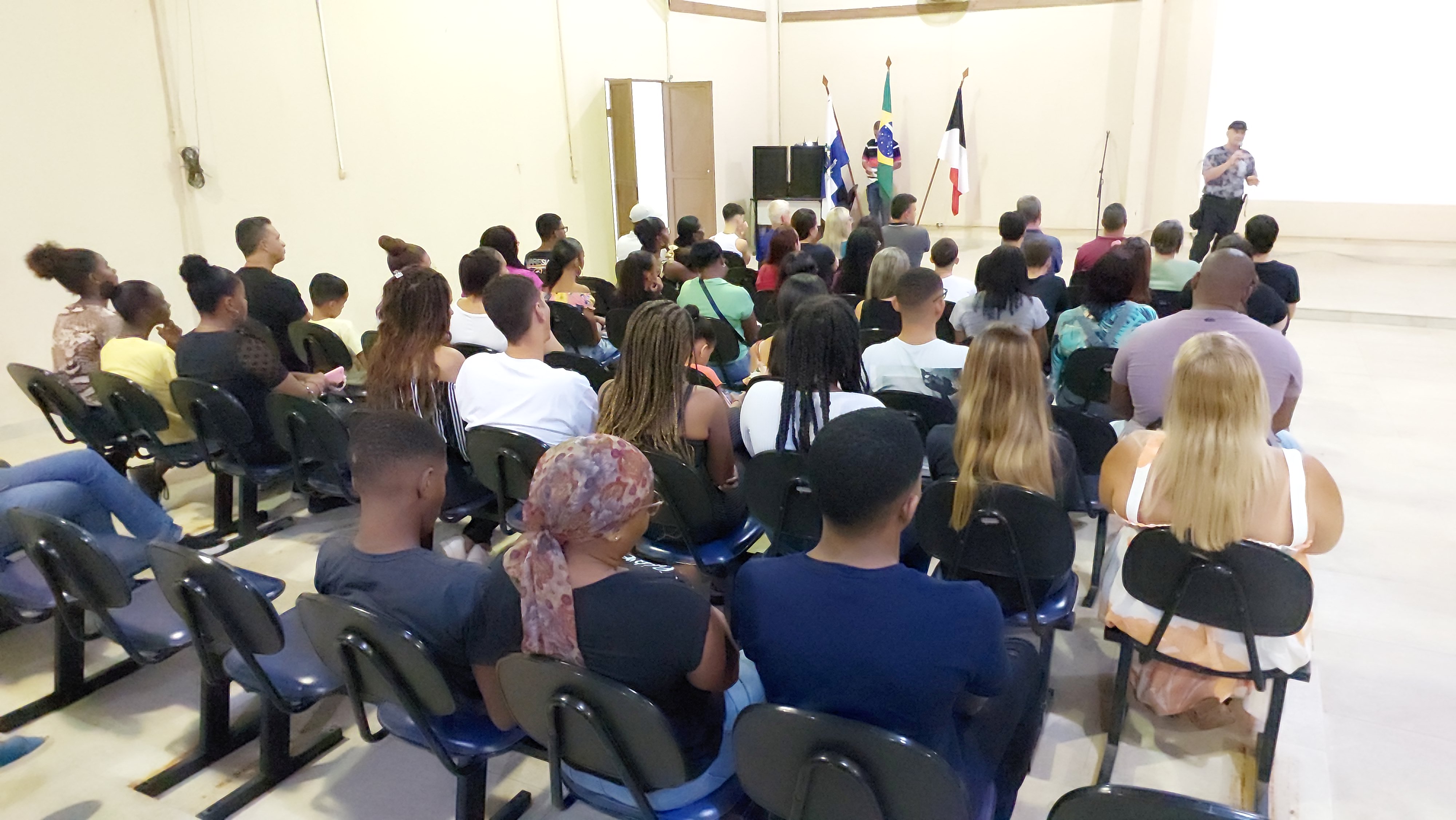 Público acompanhando atentamente as primeiras orientações do instrutor do Curso Preparatória para os estudantes