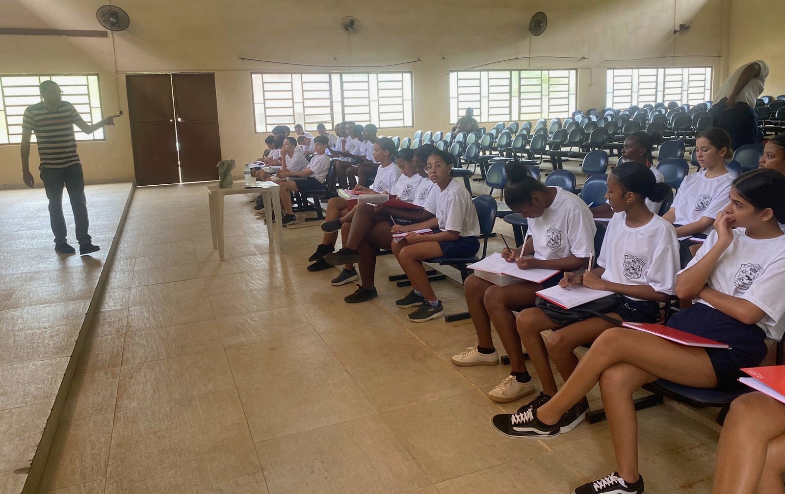 Concentrados nas explanações do Sargento Cesário, os integrantes da Guarda Mirim anotaram os pontos principais repassados pelo policial