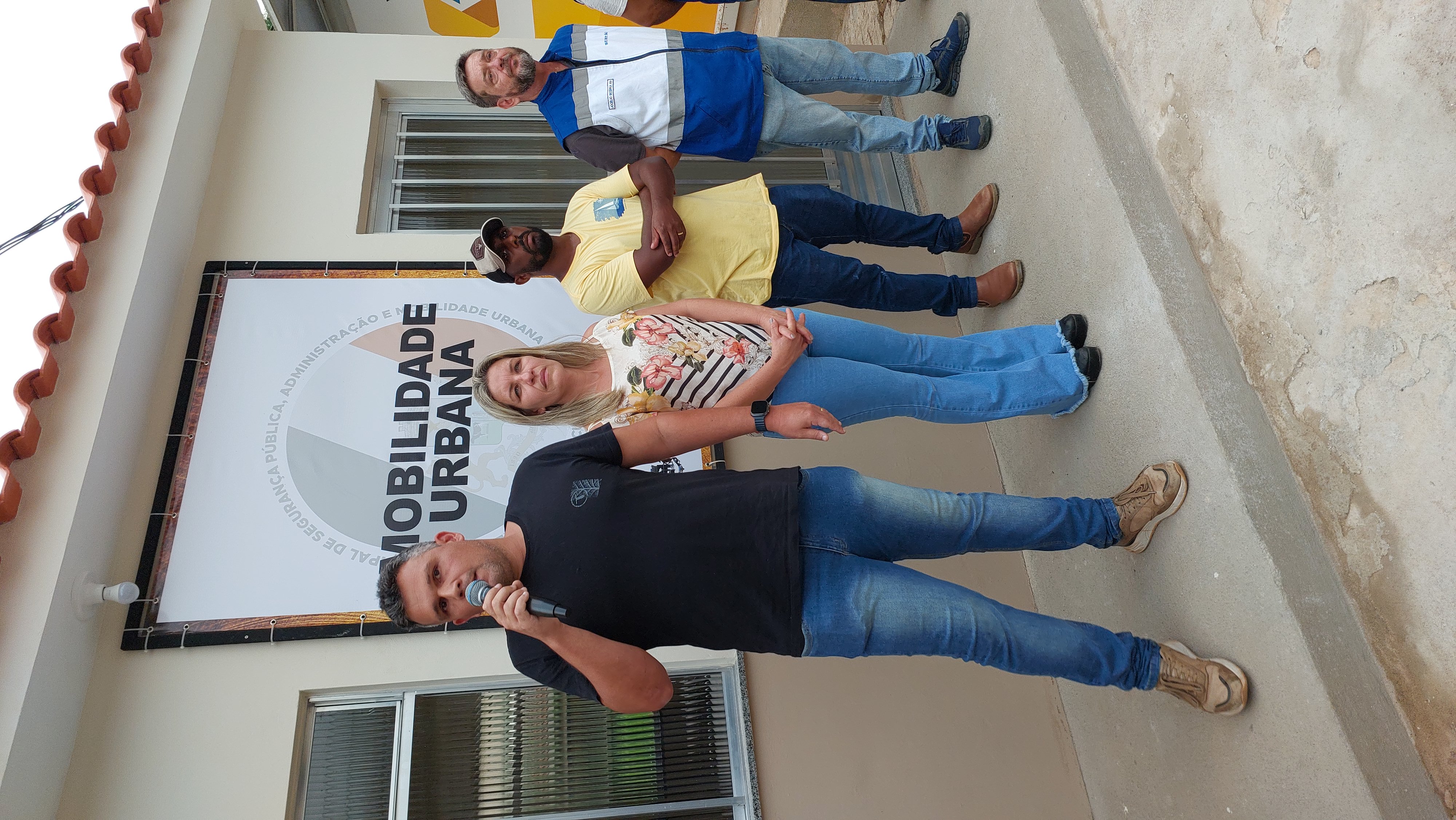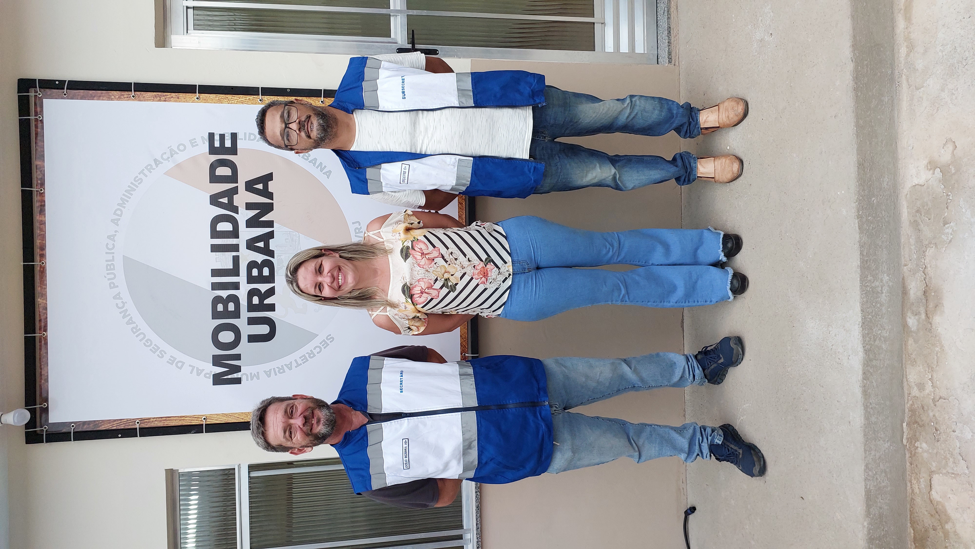 Capitão Jocélio Bezerra, prefeita Michelle Bianchini e diretor de Trânsito João Luiz Gonçalves diante da sede da Mobilidade Urbana