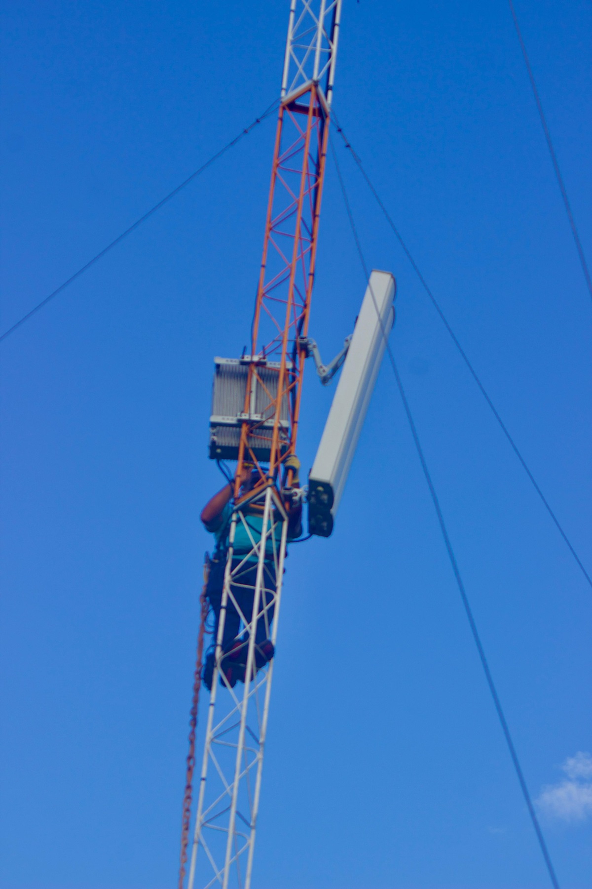 No alto da torre de telefonia, o técnico responsável analisa os detalhes para concretizar posteriormente o conserto