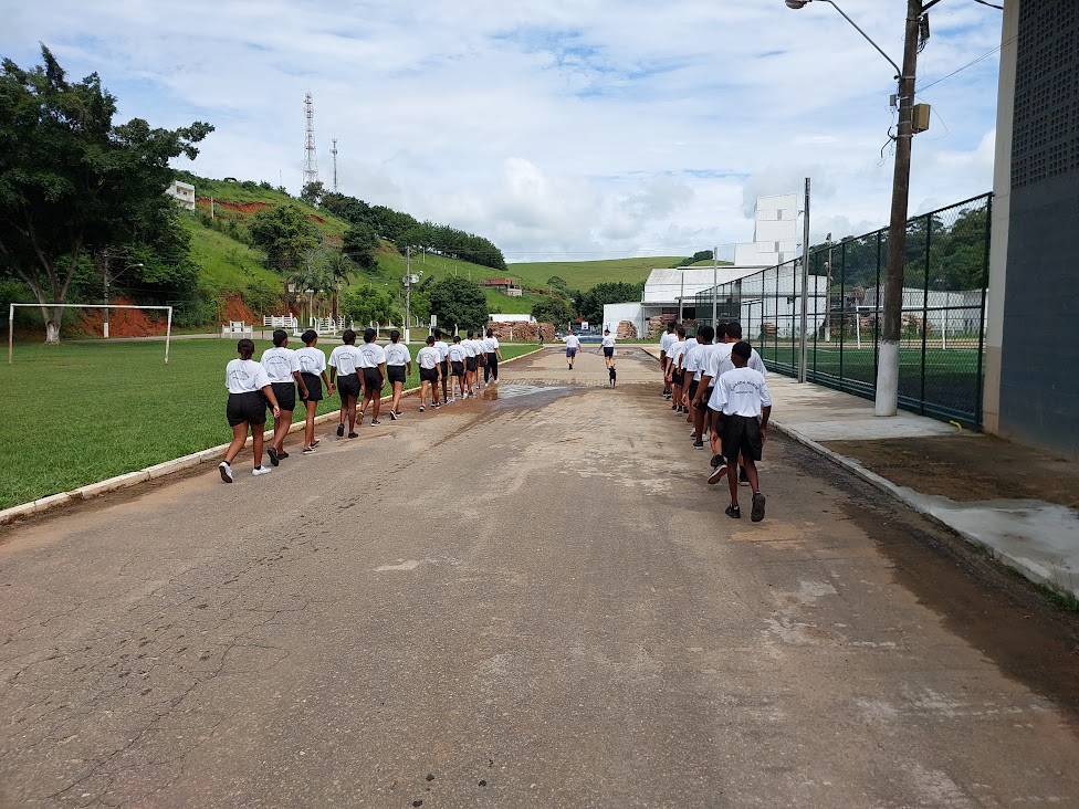 Em fila e organizadamente, os integrantes da Guarda Mirim de Macuco se dirigem ao local onde ocorreria o treinamento