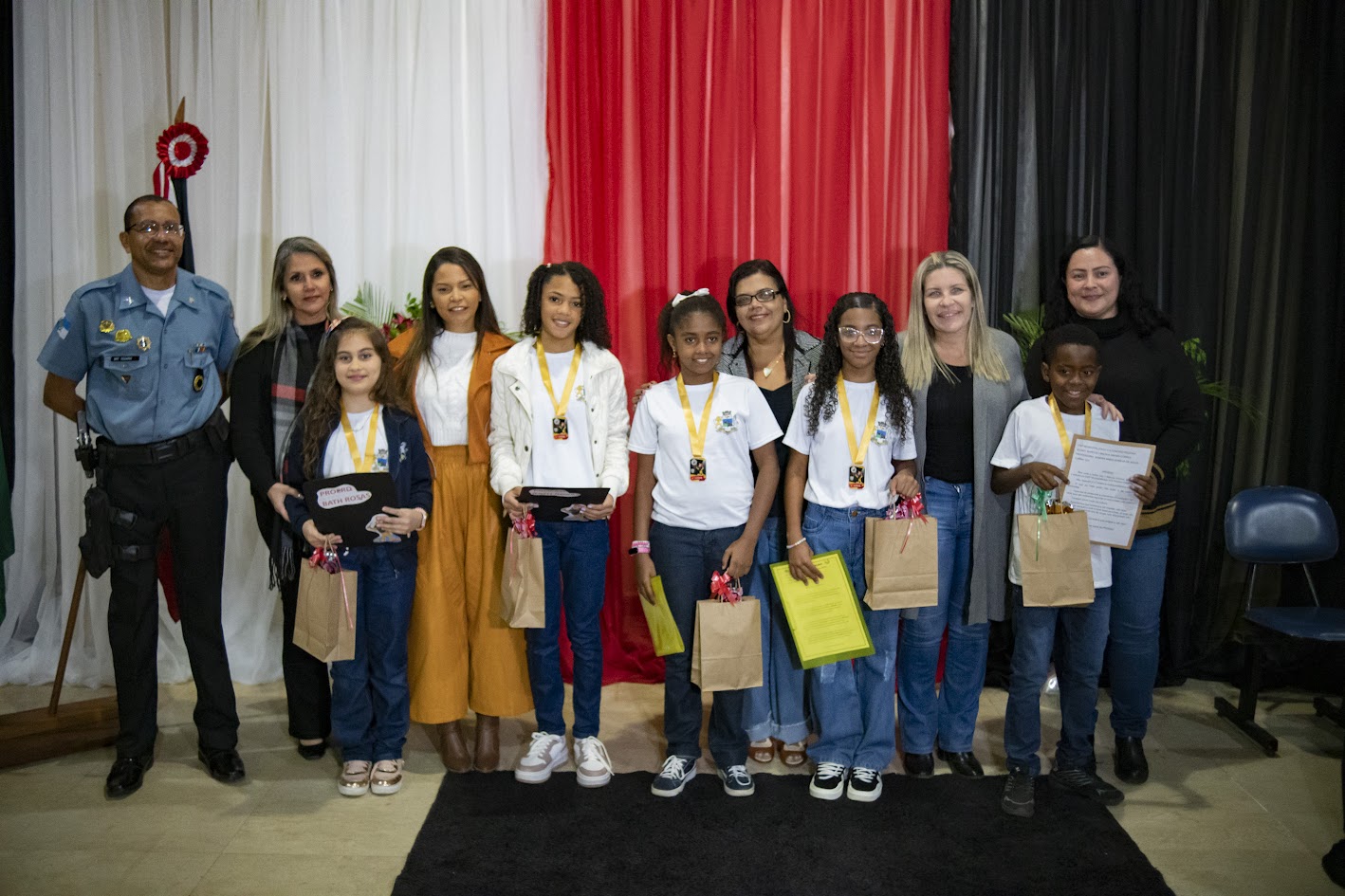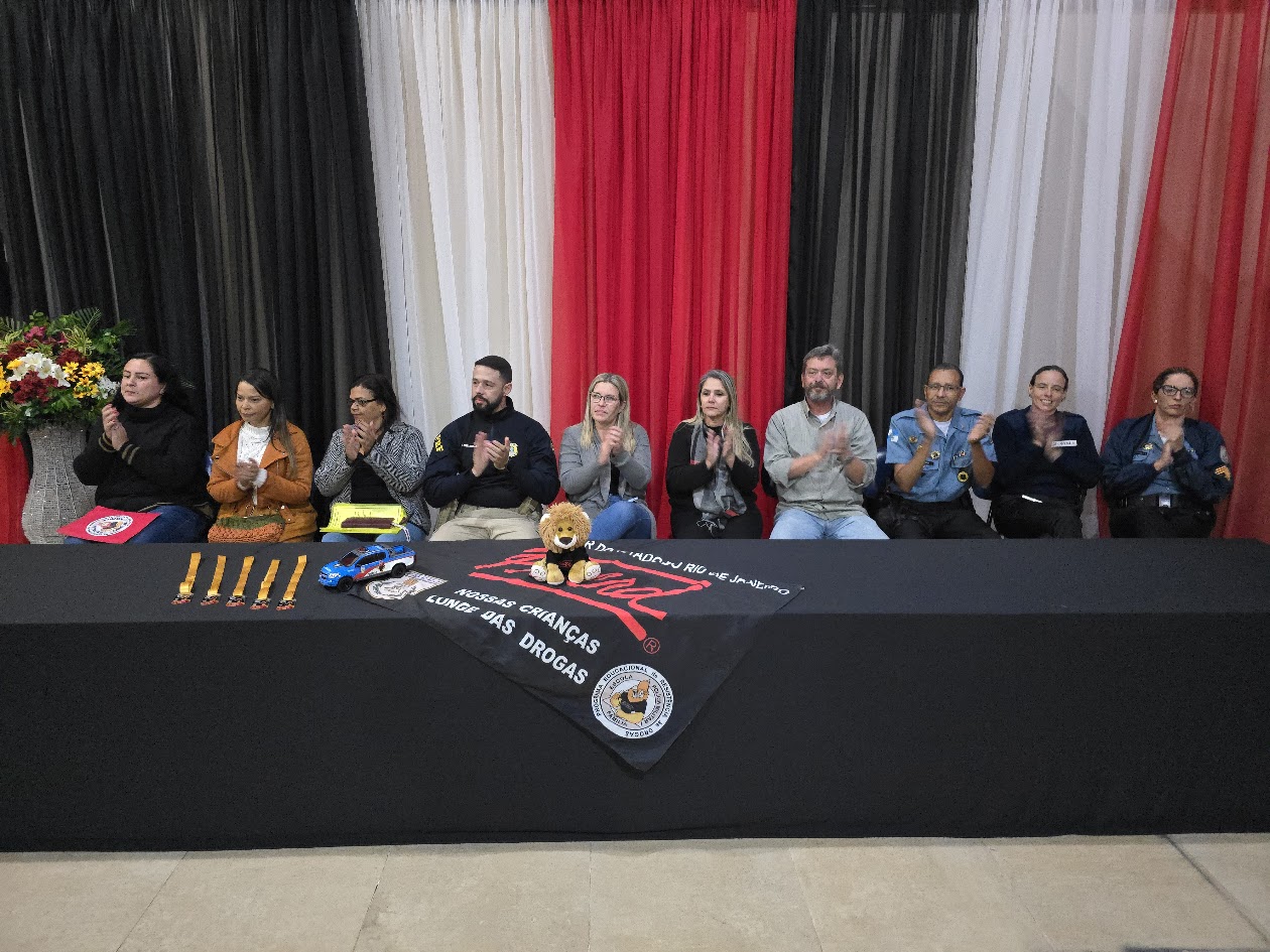 A solenidade contou com a presença de diversas autoridades que compuseram a Mesa Diretiva, como a prefeita Michelle Bianchini; a secretária de Educação, Claudia Vogas; e o secretário de Segurança Pública, Capitão Jocélio Bezerra. Também prestigiaram o evento as sargentos Carolina e Verônica, instrutoras do PROERD/Nova Friburgo; o Policial Rodoviário Federal, Luiz Eduardo Gualberto; além de diretoras e sub das unidades escolares, Patrícia Queiroz, Jesuíta Orlando e Renata Menezes. O evento foi repleto de homenagens e momentos que reforçaram a importância da parceria entre educação, família e segurança pública.