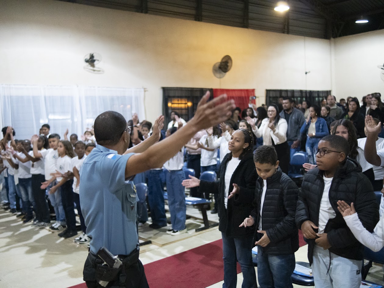 Durante a execução dos hinos e noutros momentos cruciais do evento, os alunos expuseram a disciplina conquistada durante o curso do PROERD