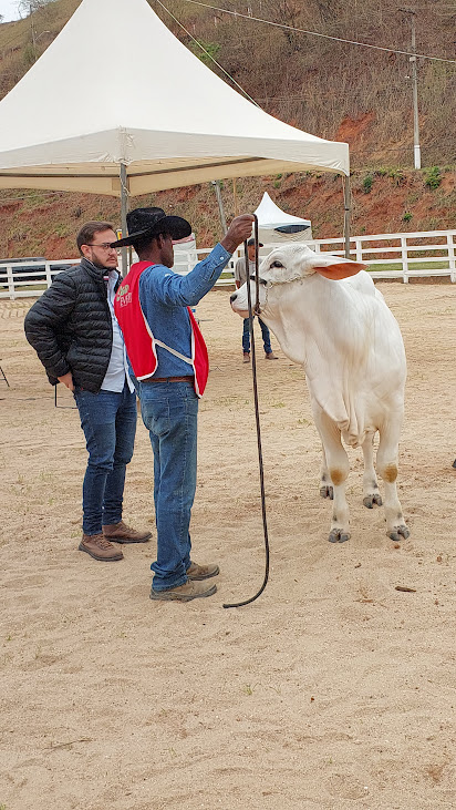 Condutor de um dos exemplares da Raça Tabapuã seguindo as orientações do julgador para que os atributos possam ser mais bem observados