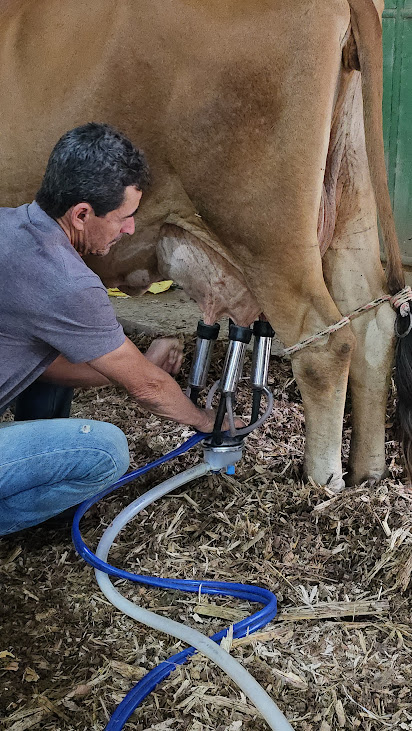 Trabalho em dupla para garantir um resultado mais ligeiro e satisfatório quando é chegada a hora da ordenha, que acontece três vezes diariamente