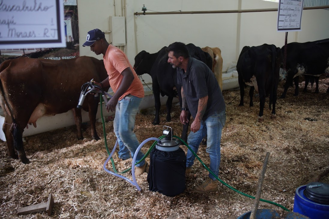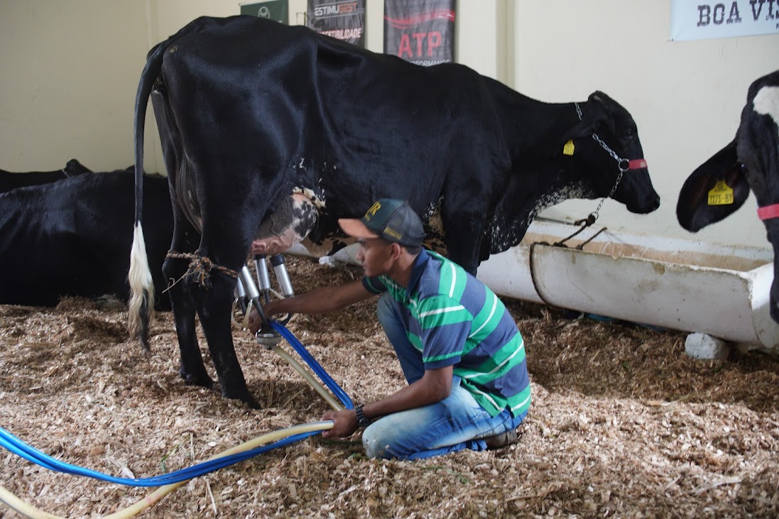 Movimento repetido três vezes por dia pelo profissional rural para dar conta das retiradas do leite da vaca integrante da competição