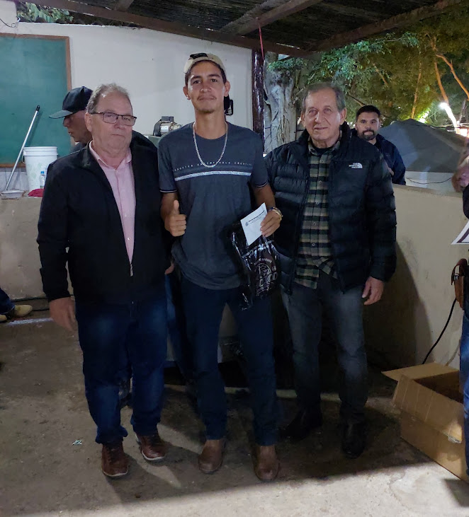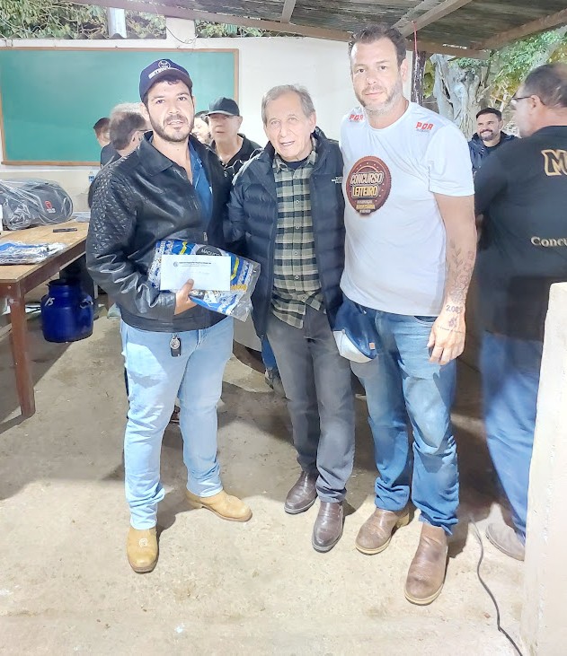 Presidente Silvio Marino (ao centro) fazendo a entrega de premiação a mais dois participantes do Concurso Leiteiro da Expo-Macuco 2025