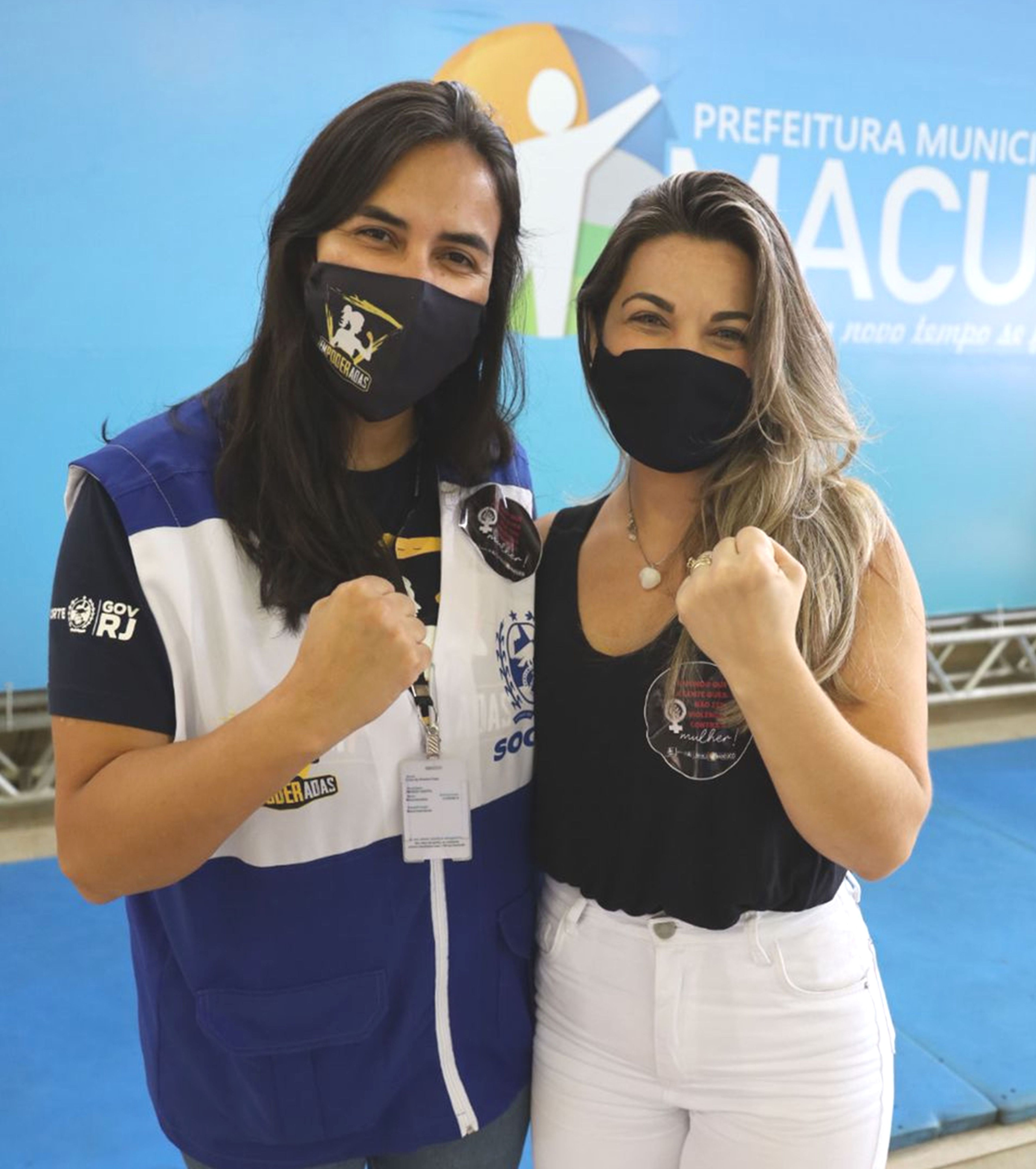 Erica Paes e a secretária Cláudia Bonan posam para a fotografia com os punhos cerrados, símbolo adotado para o empoderamento feminino
