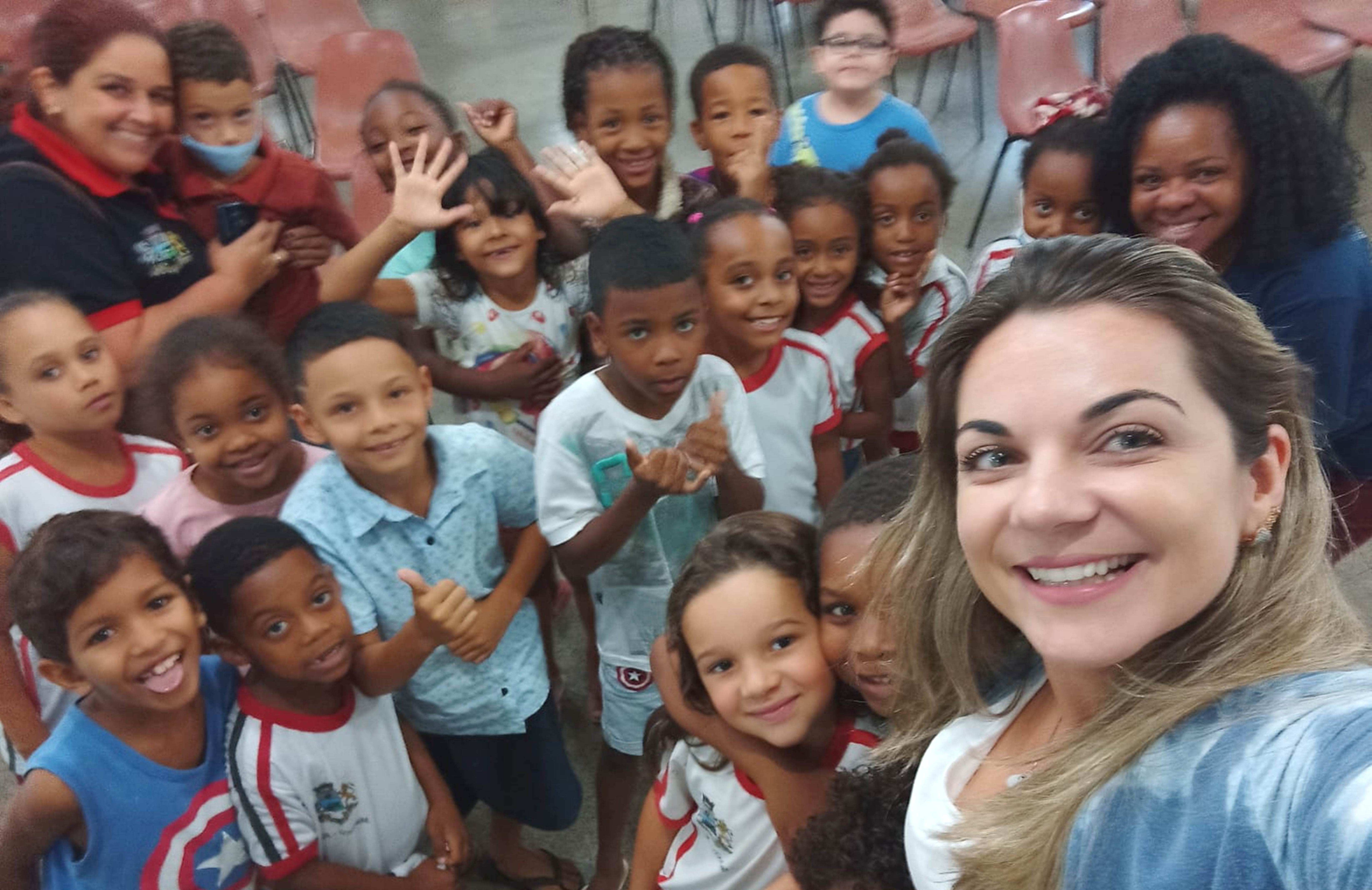 Selfie feita pela secretária de Desenvolvimento Social Claudia Bonan comprova a integração com as escolas da cidade