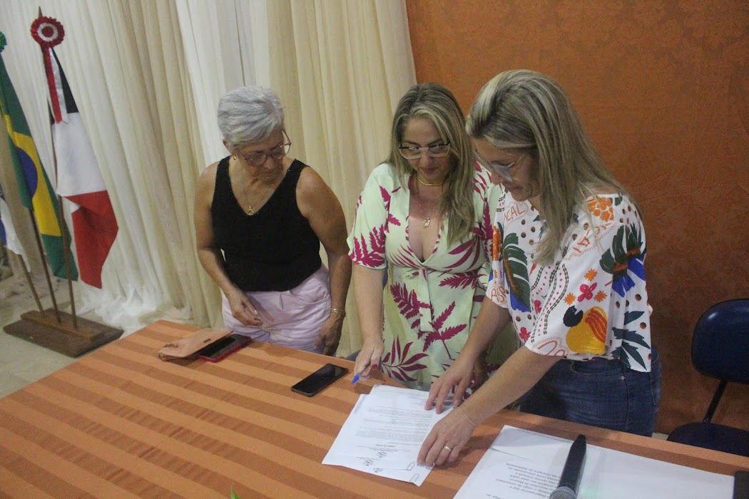 Juntamente com a prefeita Michelle Bianchini, duas das novas conselheiras assinam o termo de posse durante a solenidade