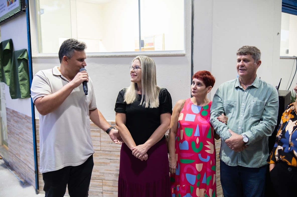 Ao lado do esposo João Vitor, do Pastor Anélio Martinelli e de sua esposa Jerusa, a prefeita Michelle Bianchini faz seu discurso de inauguração