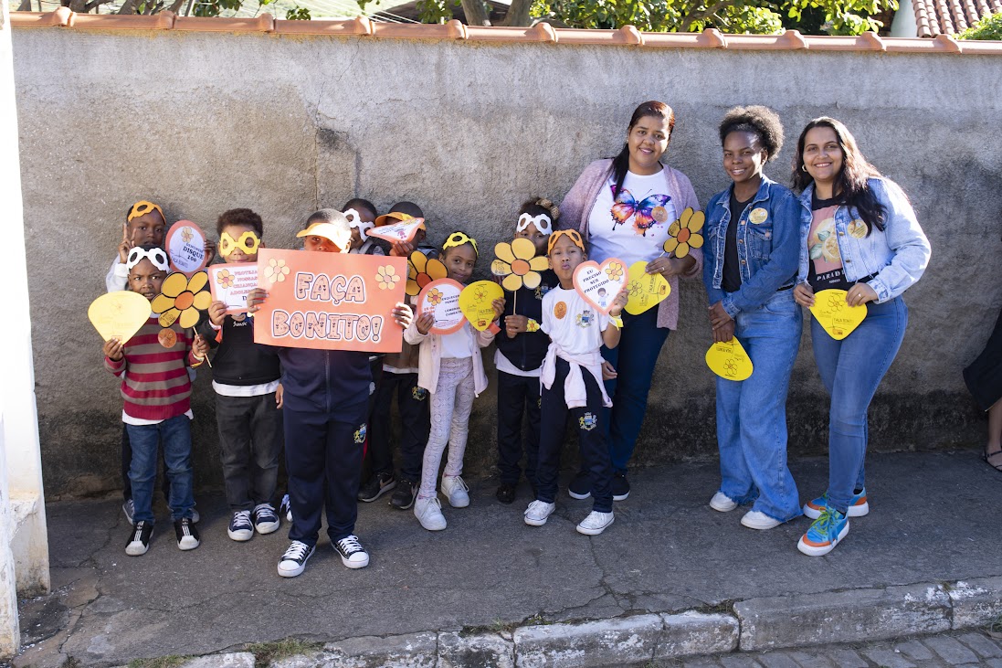 Crianças e professoras unidas pela passeata e demonstrando que a união em Macuco é sempre uma ferramenta importante