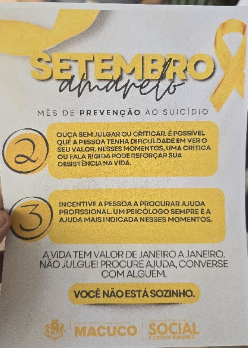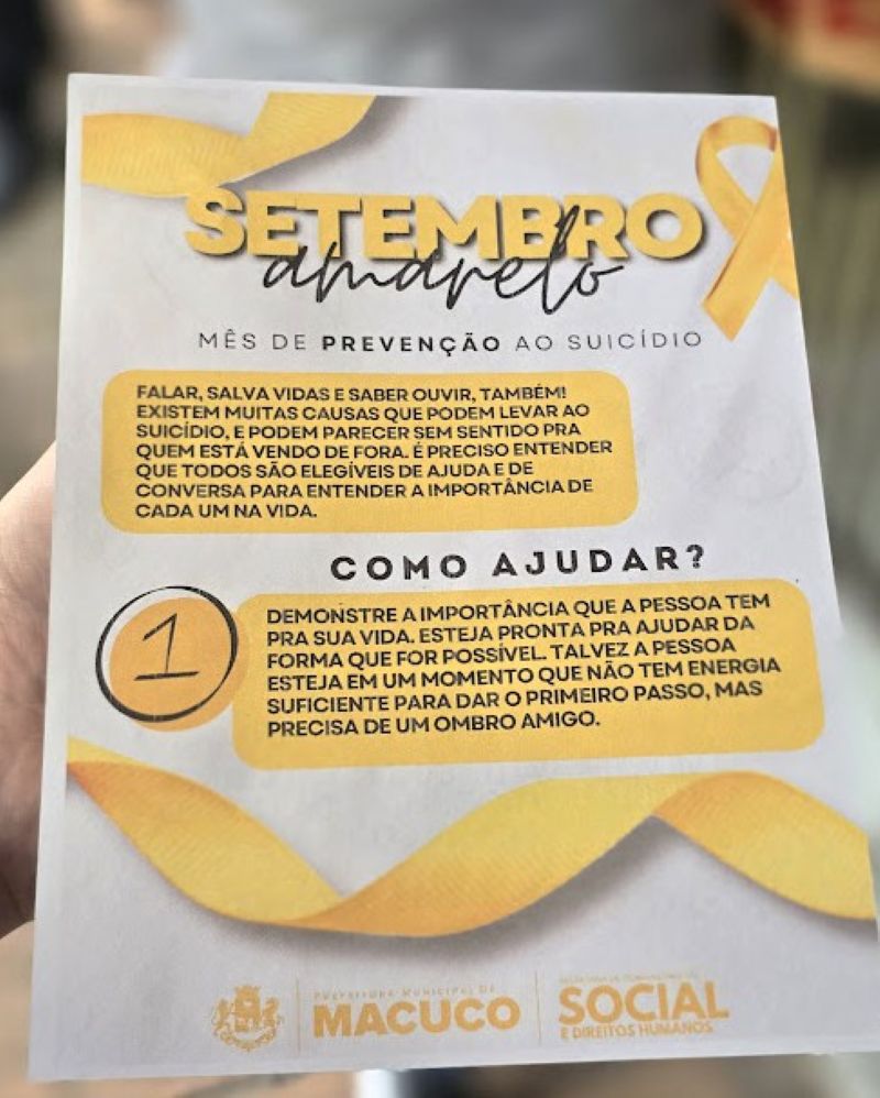 Nesta segunda-feira, dia 29 de setembro, a cidade de Macuco se uniu em uma importante causa: a finalização da indispensável campanha ‘Setembro Amarelo’. Sob a liderança da Secretaria de Desenvolvimento Social e Direitos Humanos, comandada pela assistente social Tatiane Bormevet, a ação visou conscientizar a população sobre a prevenção ao suicídio e a importância de buscar ajuda para problemas psicológicos.