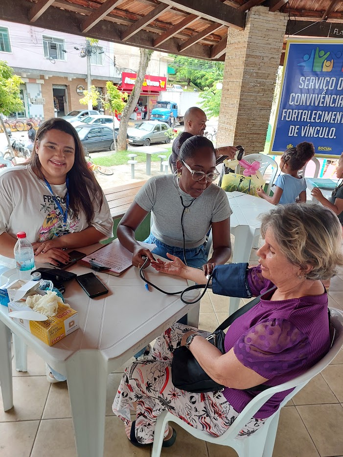 Equipe da Secretaria de Saúde aferindo a pressão arterial de uma das participantes, mostrando os cuidados também com a qualidade de vida da população