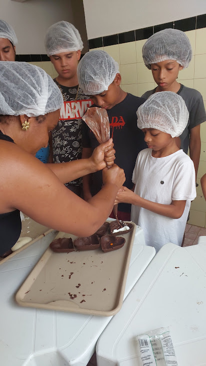 Para conhecer os segredos da confeitaria artesanal no CRAS II, a prática estimulou a criatividade e o protagonismo dos jovens aprendizes da chocolataria