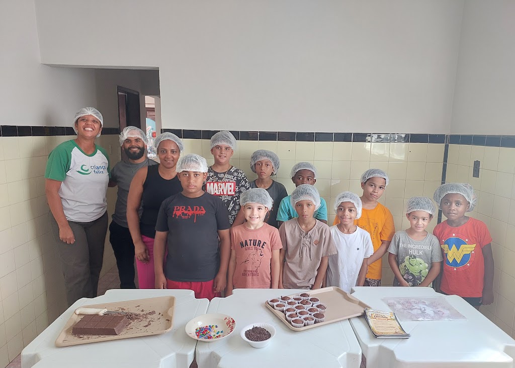A equipe unida e pronta para transformar ingredientes simples em doces memórias, numa celebração do talento e da integração da garotada