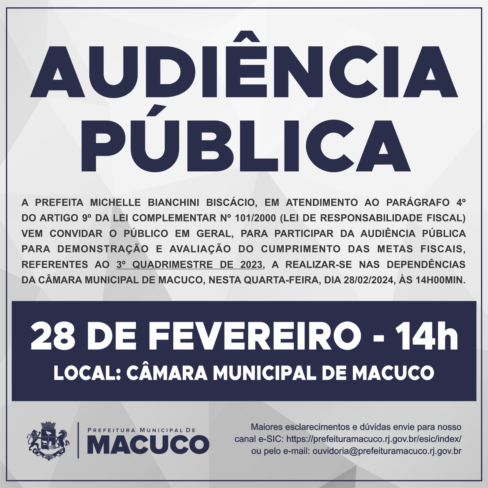 A Prefeita Michelle Bianchini Biscácio, em atendimento ao § 4º, do Art. 9º da Lei Complementar nº 101/2000 (Lei de Responsabilidade Fiscal), vem convidar o público em geral para participar da audiência pública para demonstração e avaliação do cumprimento das metas fiscais referentes ao 3º quadrimestre de 2023, a realizar-se nas dependências da Câmara Municipal de Macuco, nesta quarta-feira, dia 28/02/2024, às 14h.