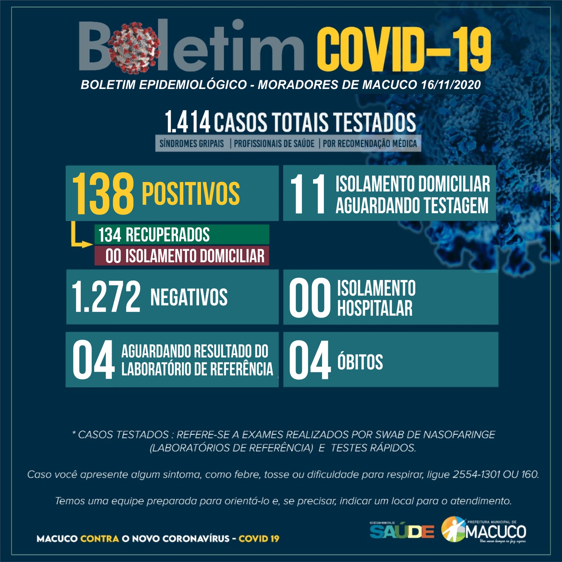 Boletim atualizado sobre o COVID-19 em Macuco - 16/11