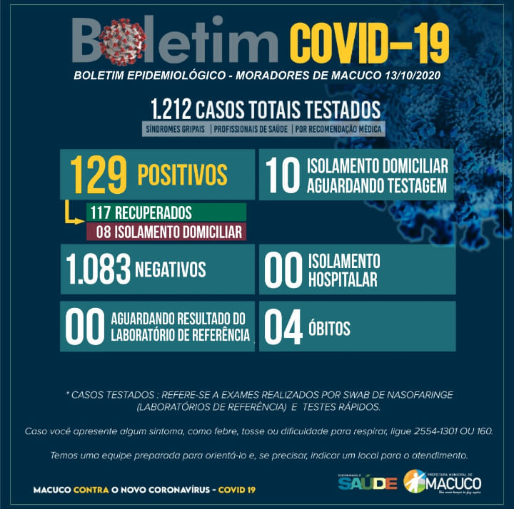 Boletim atualizado sobre o COVID-19 em Macuco - 13/10