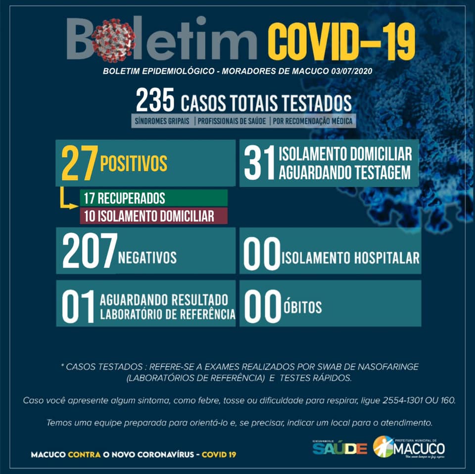 Boletim atualizado sobre o COVID-19 em Macuco - 03/07