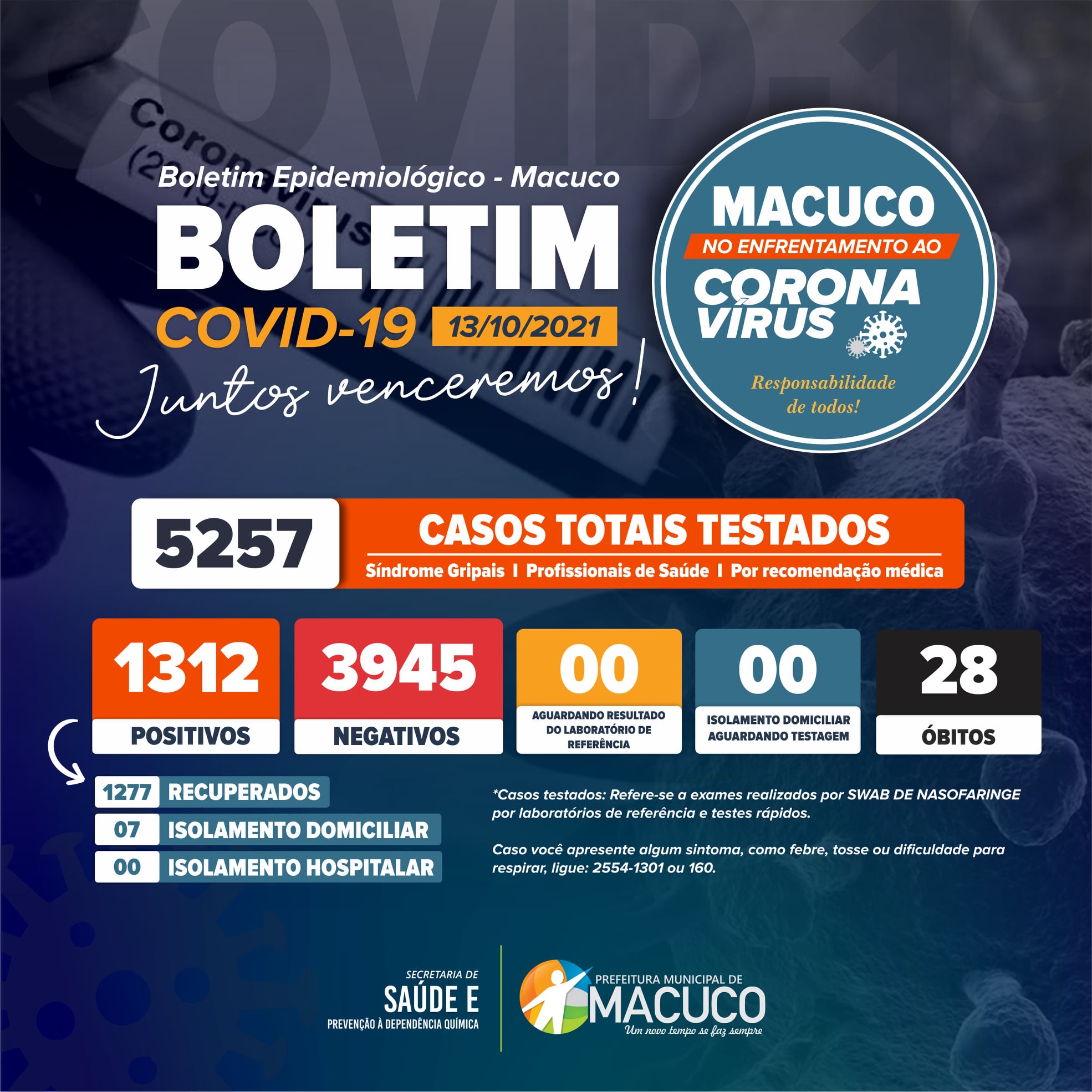 Boletim atualizado sobre o COVID-19 em Macuco - 13/10/2021