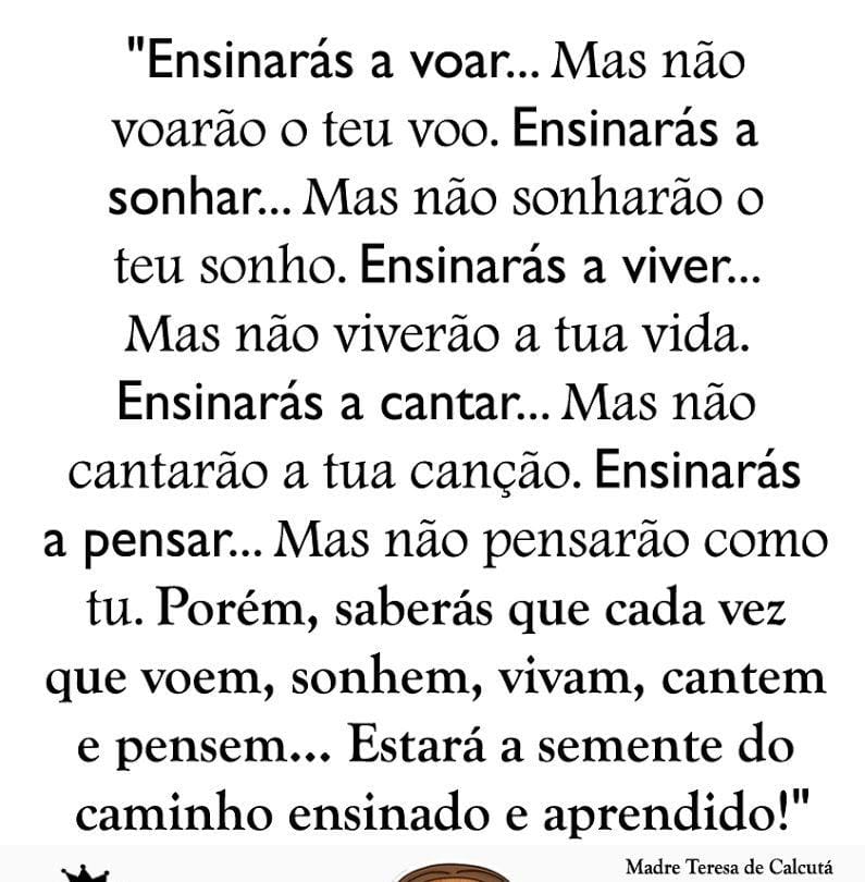 Só quem vive o dia a dia de uma sala de aula; quem tem a capacidade de transformar lições de vida para toda vida; quem põe fé que tudo terá valido à pena se o seu aluno alcançar os objetivos; quem entra numa sala de aula e consegue transformar em aventura o que ensina e aprende; quem tem o poder de todos os dias fazer sua aula única e original; quem tem a capacidade de, repartindo conhecimentos e experiências, nos fazer acreditar que somos transformadores de sonhos em realidade.