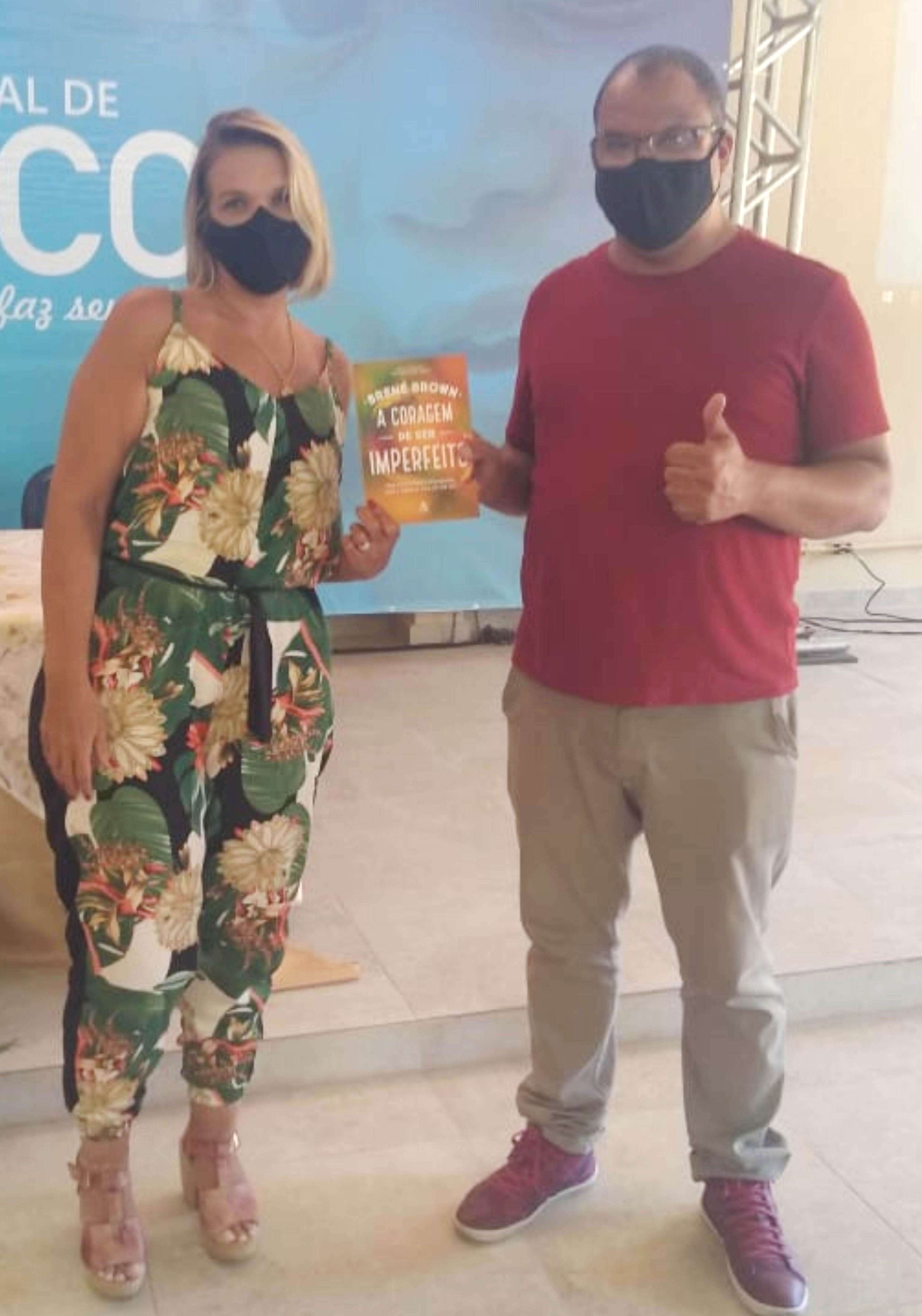 Luciana Boaretto com um livro ao lado do coach Claudio Pires Cardoso
