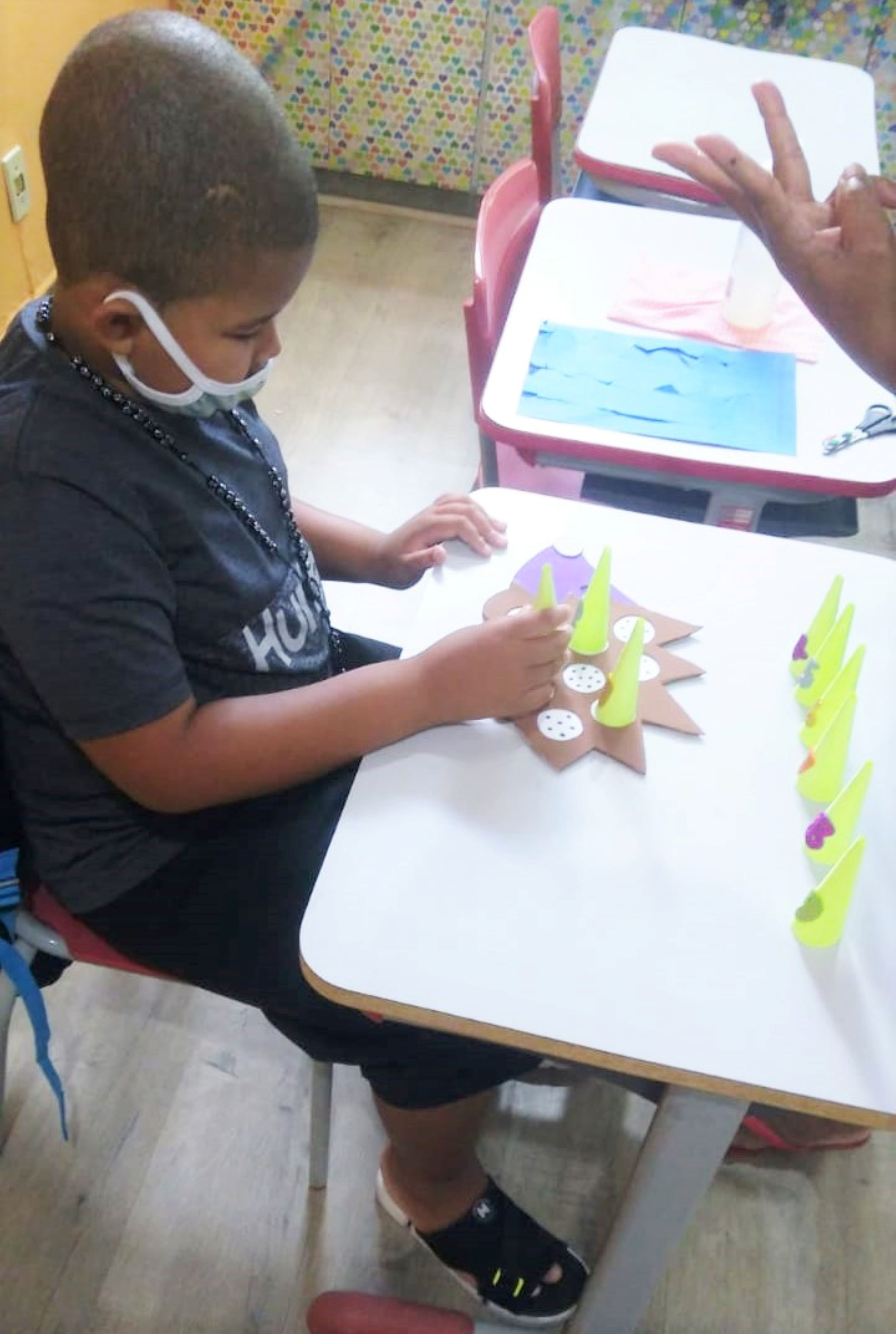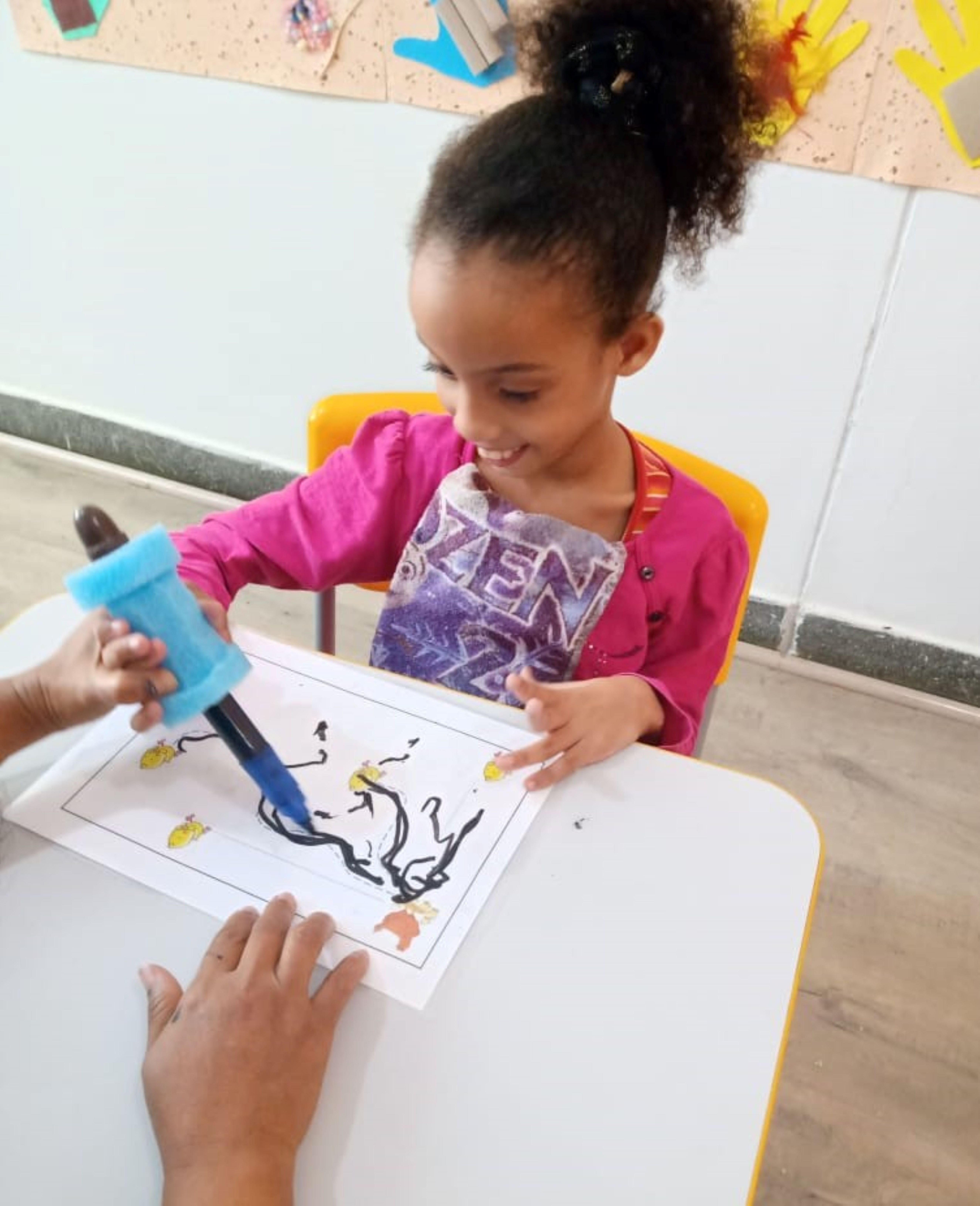 O sorriso fácil da menina e a mão cuidadosa da orientadora numa atividade