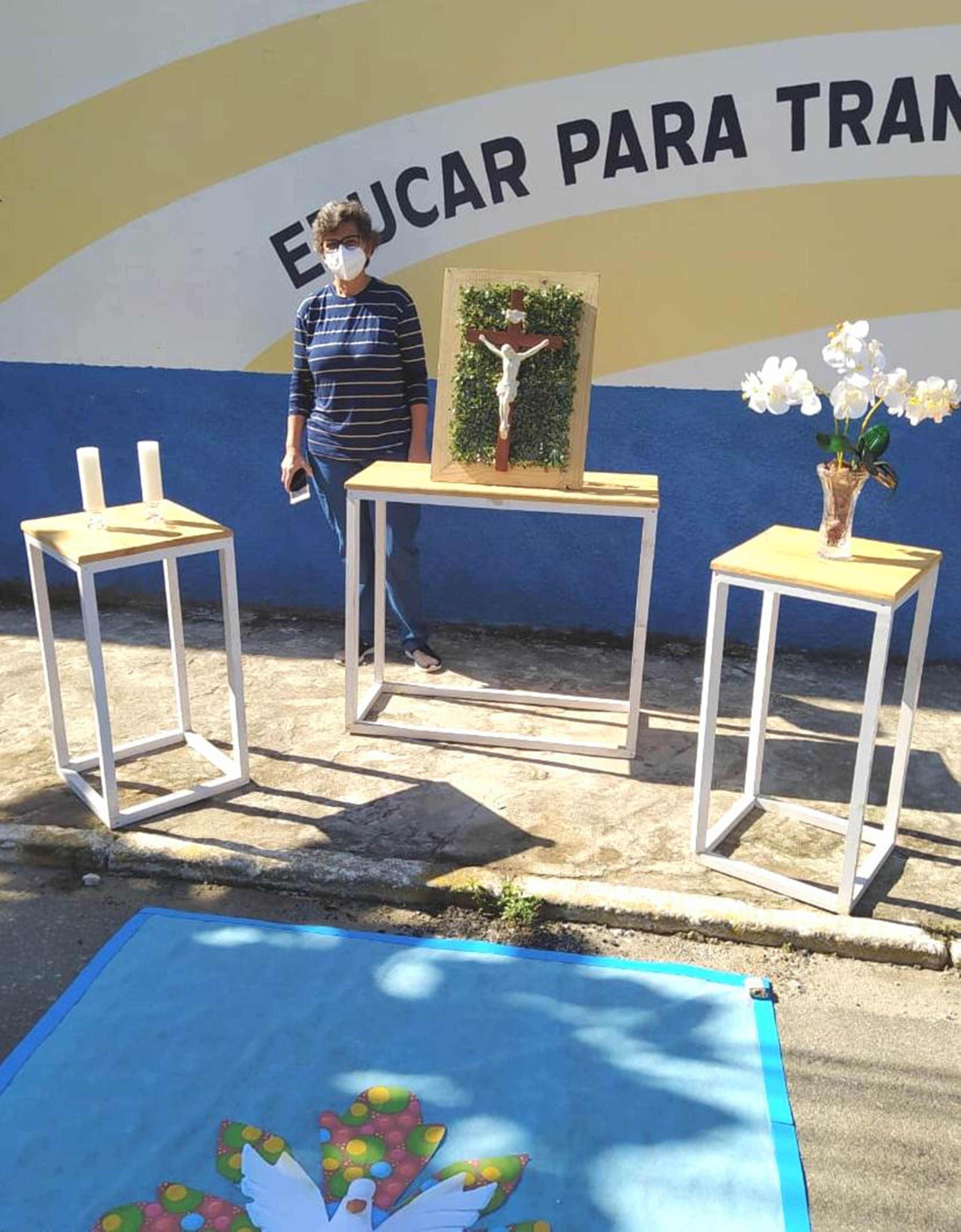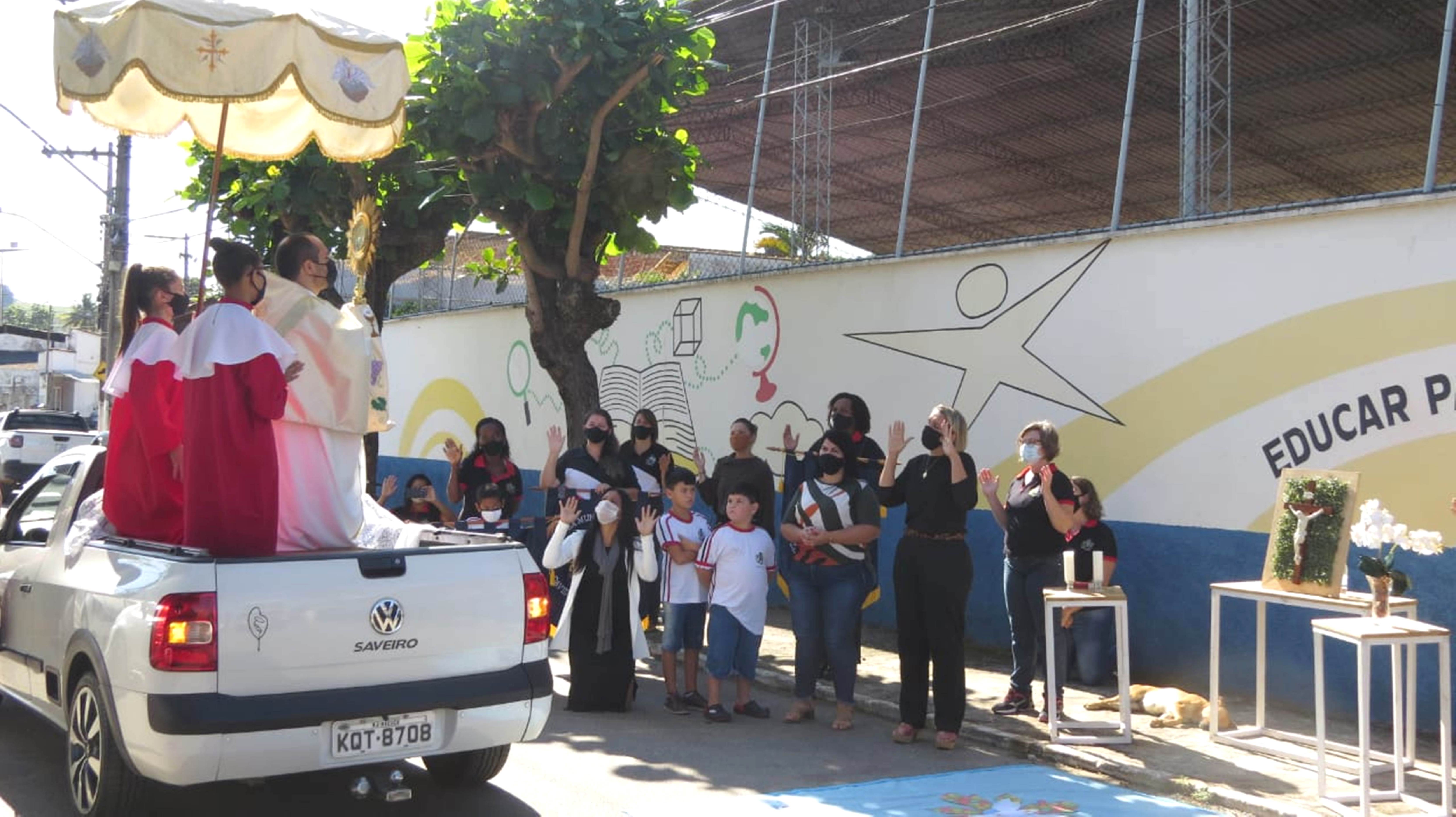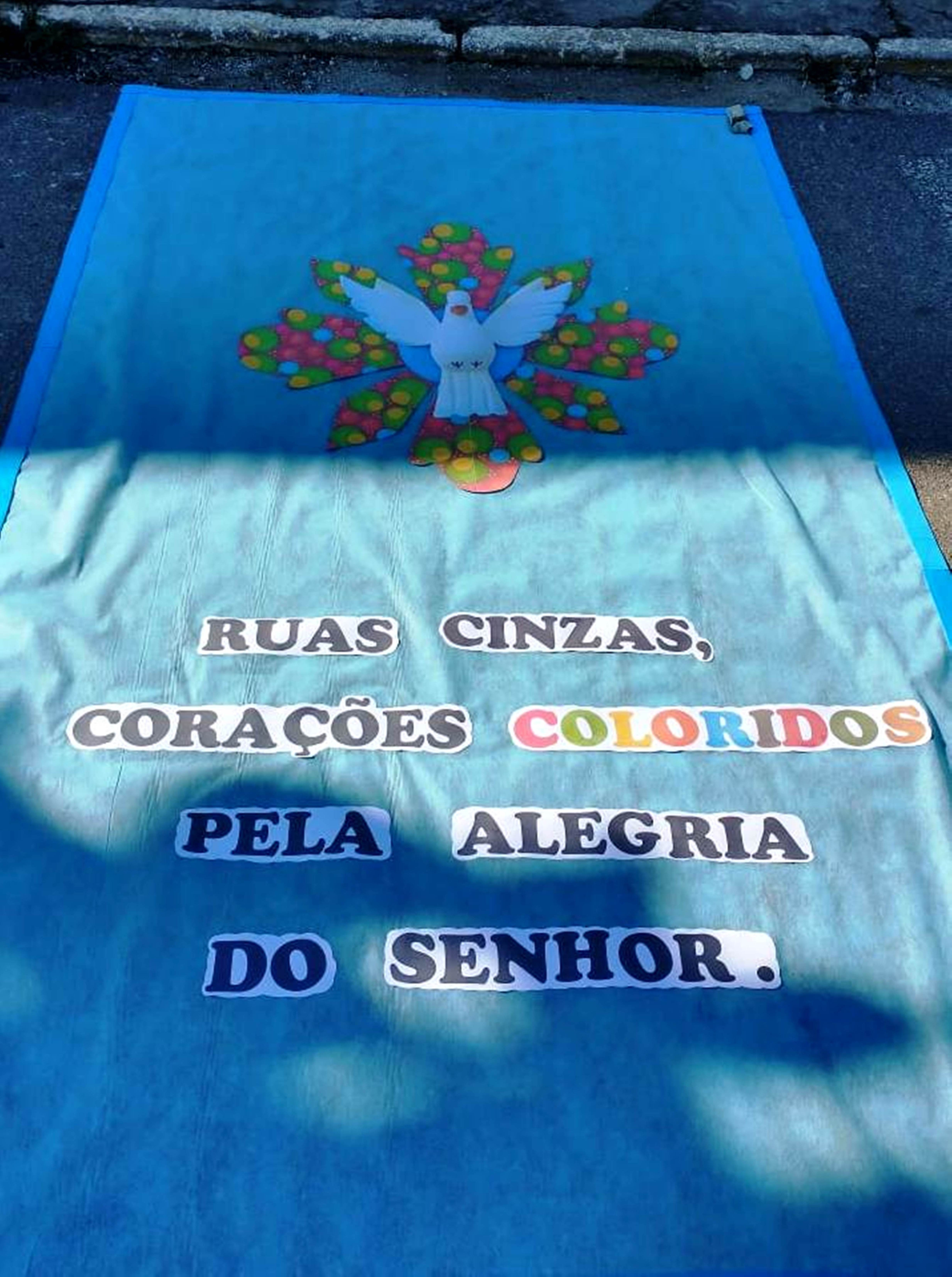 Na ausência dos multicoloridos, criativos, diversificados e sempre muito bem elaborados tapetes, que tradicionalmente cobriam o chão nas ruas da cidade e aumentavam ainda mais a emoção dos fiéis durante as cerimônias religiosas de Corpus Christi, os integrantes do segmento educacional criaram um pequeno tapete próximo ao Colégio José Carlos Boaretto para marcar a data e receber a benção do cortejo católico.