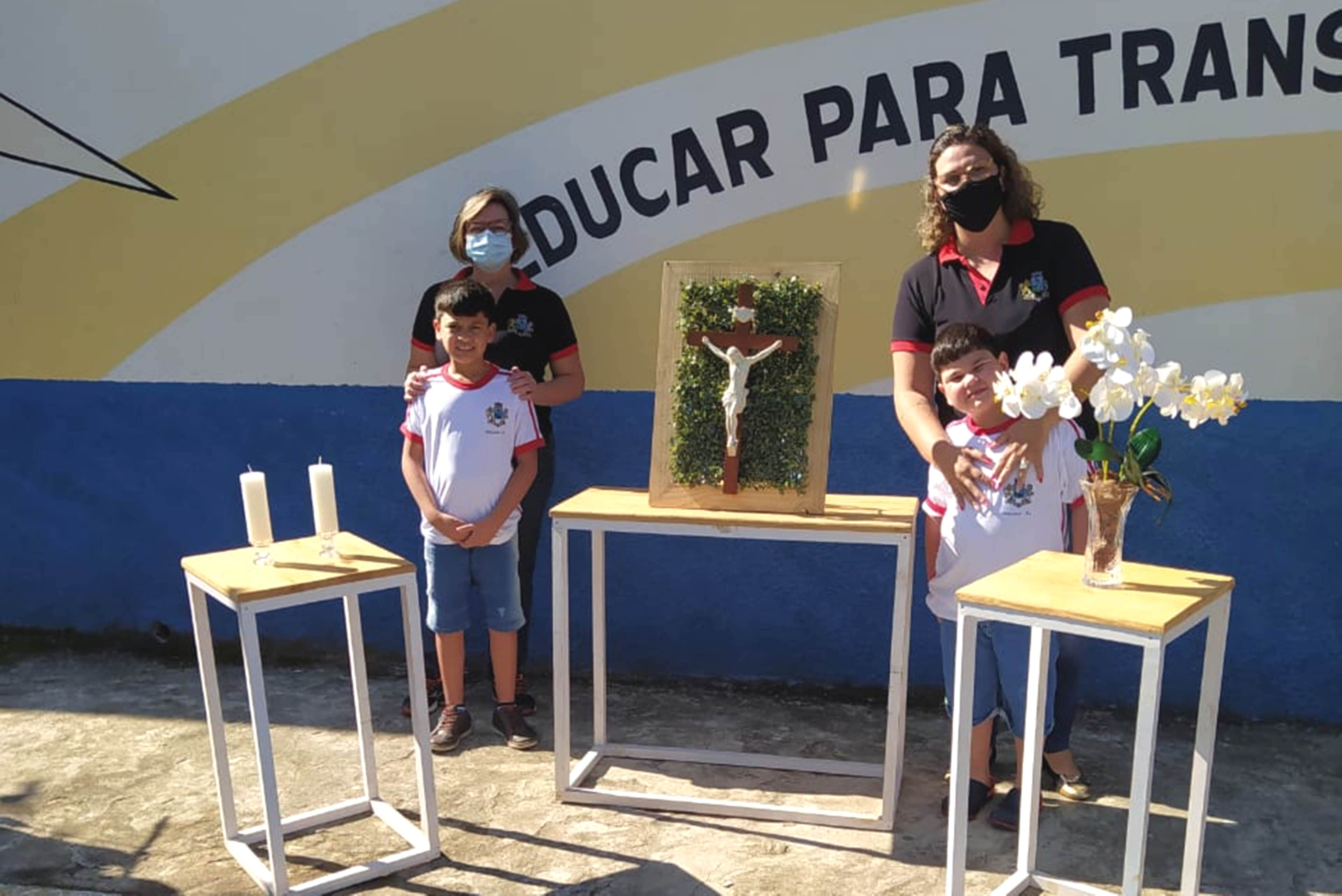 Alunos, professores, diretores e gestores oram com a passagem do Santíssimo