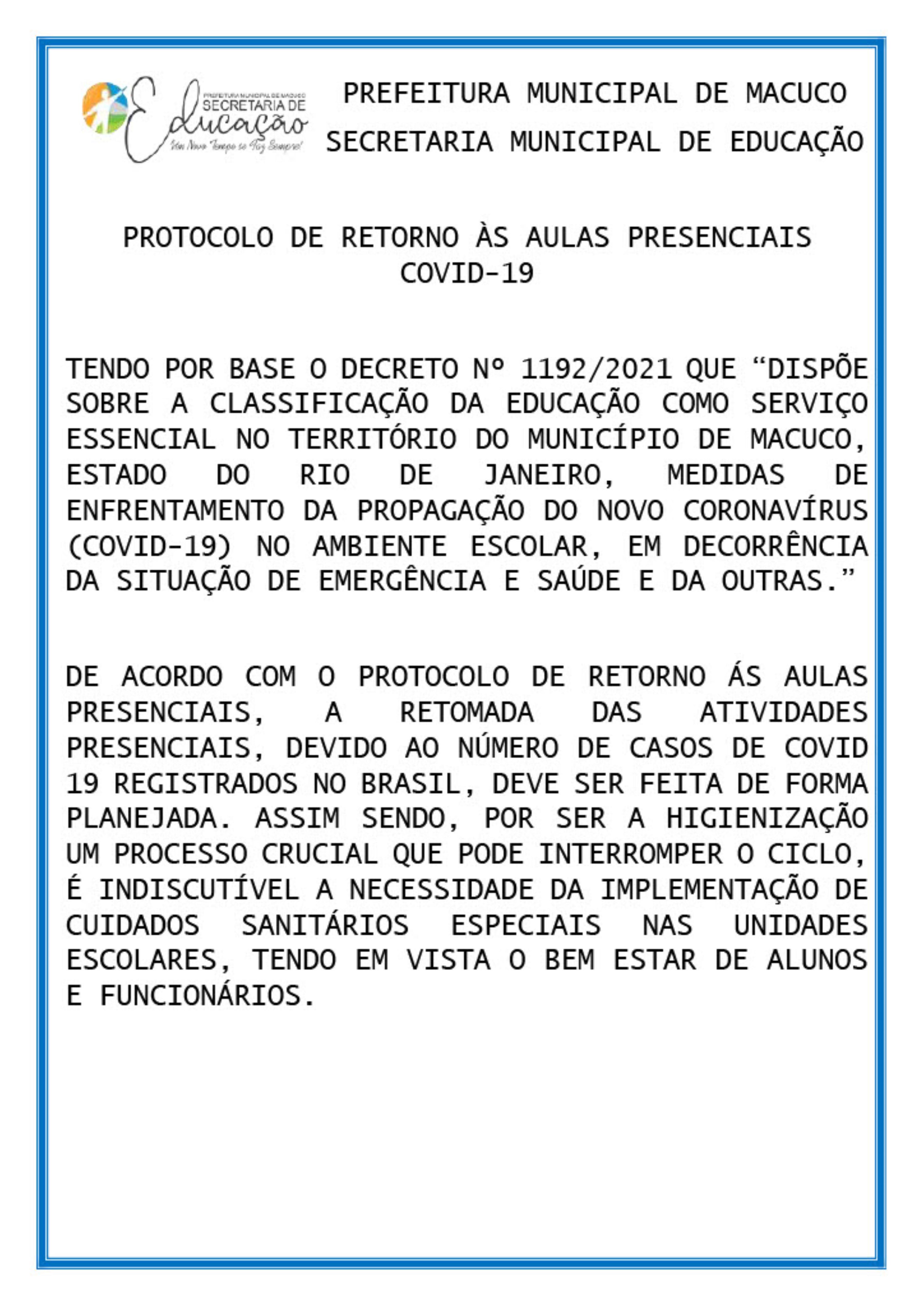 Demonstrando seguir à risca todas as regras específicas para que as aulas presenciais, quando retomadas, ofereçam aos estudantes macuquenses um ambiente escolar seguro e higienizado, com um planejamento sério e consciente, a Secretaria de Educação implementa cuidados sanitários especiais para atender a todas as unidades escolares, como confirma o Protocolo de Retorno distribuído durante o encontro.