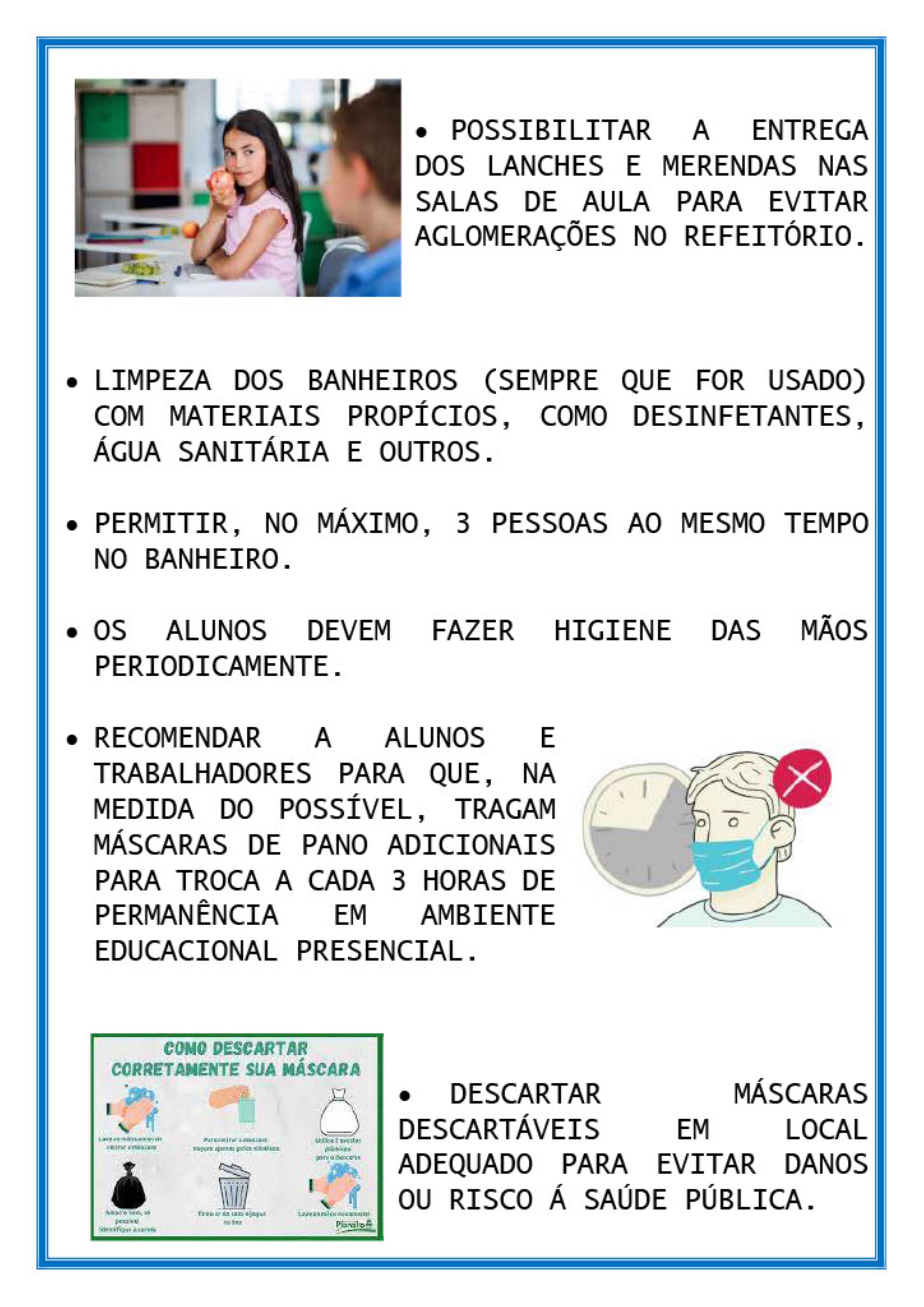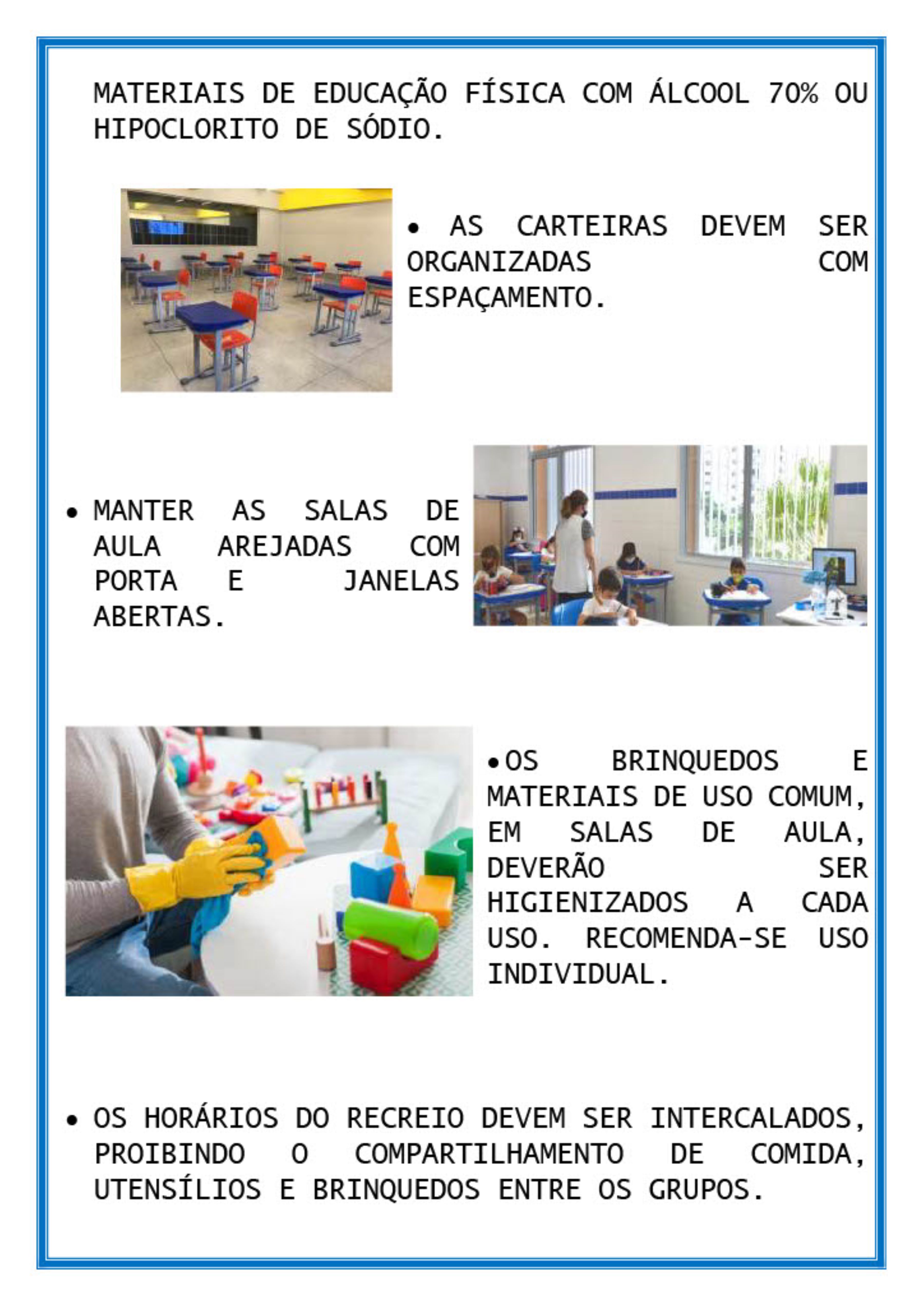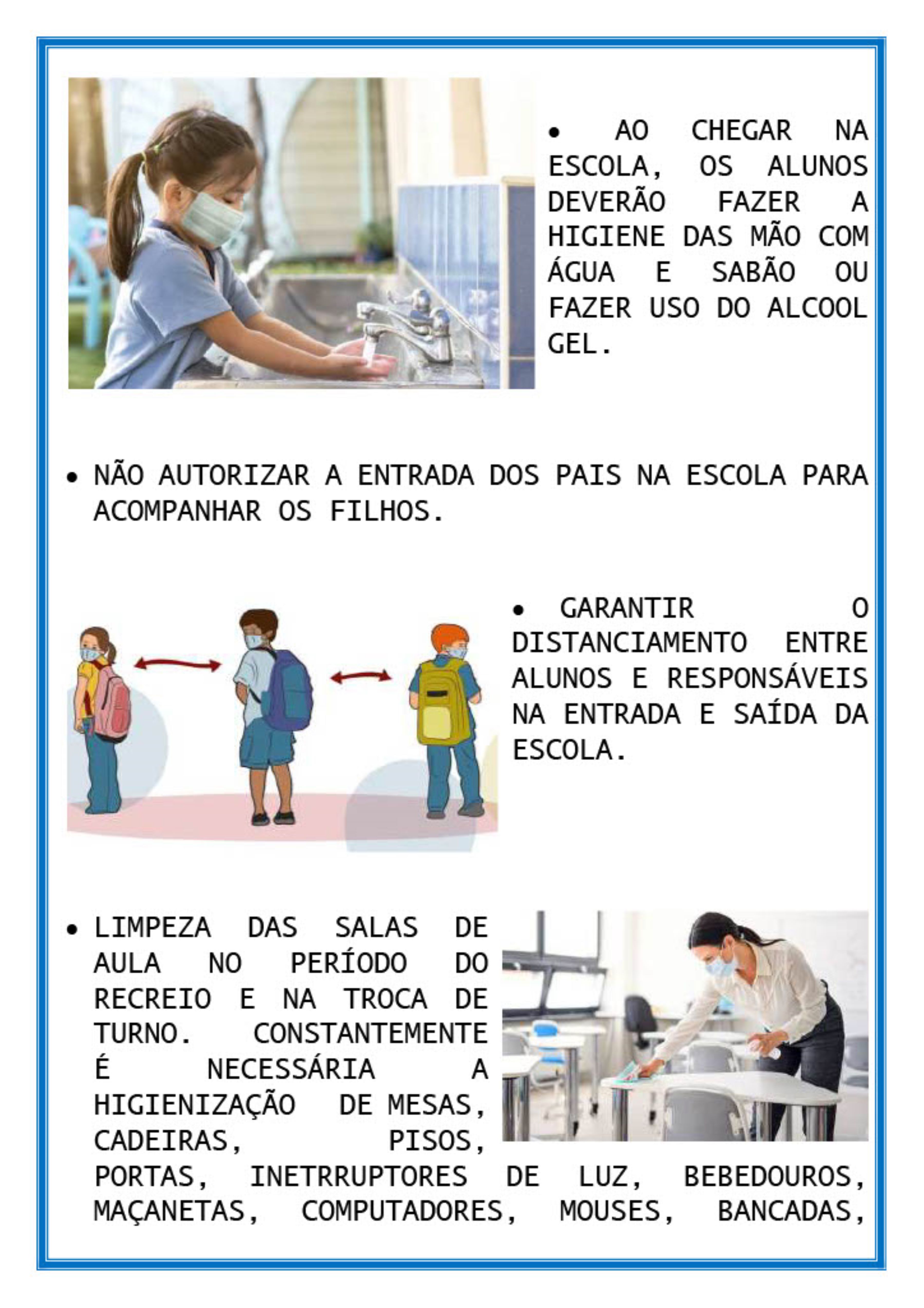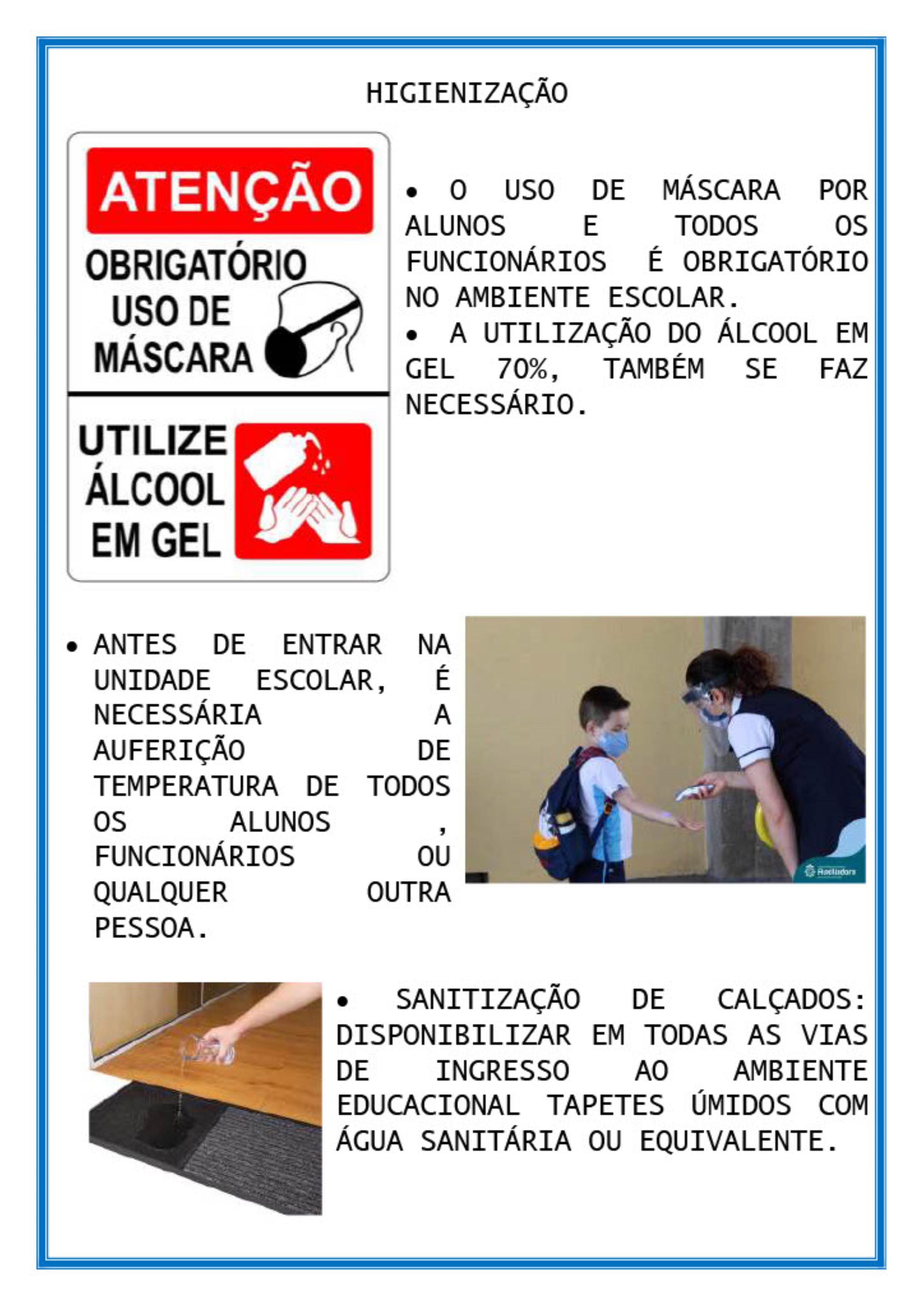 No material entregue aos profissionais estão descritas algumas das obrigatoriedades, como o uso de máscaras por alunos e funcionários; utilização do álcool em gel 70%; sanitização de calçados em tapetes contendo água sanitária ou equivalente; higienização das mãos com água e sabão; restrição da entrada dos pais na escola; distanciamento entre alunos e responsáveis na entrada e saída da escola; e limpeza das salas de aula no recreio e troca de turno, com a correta higienização dos ambientes.