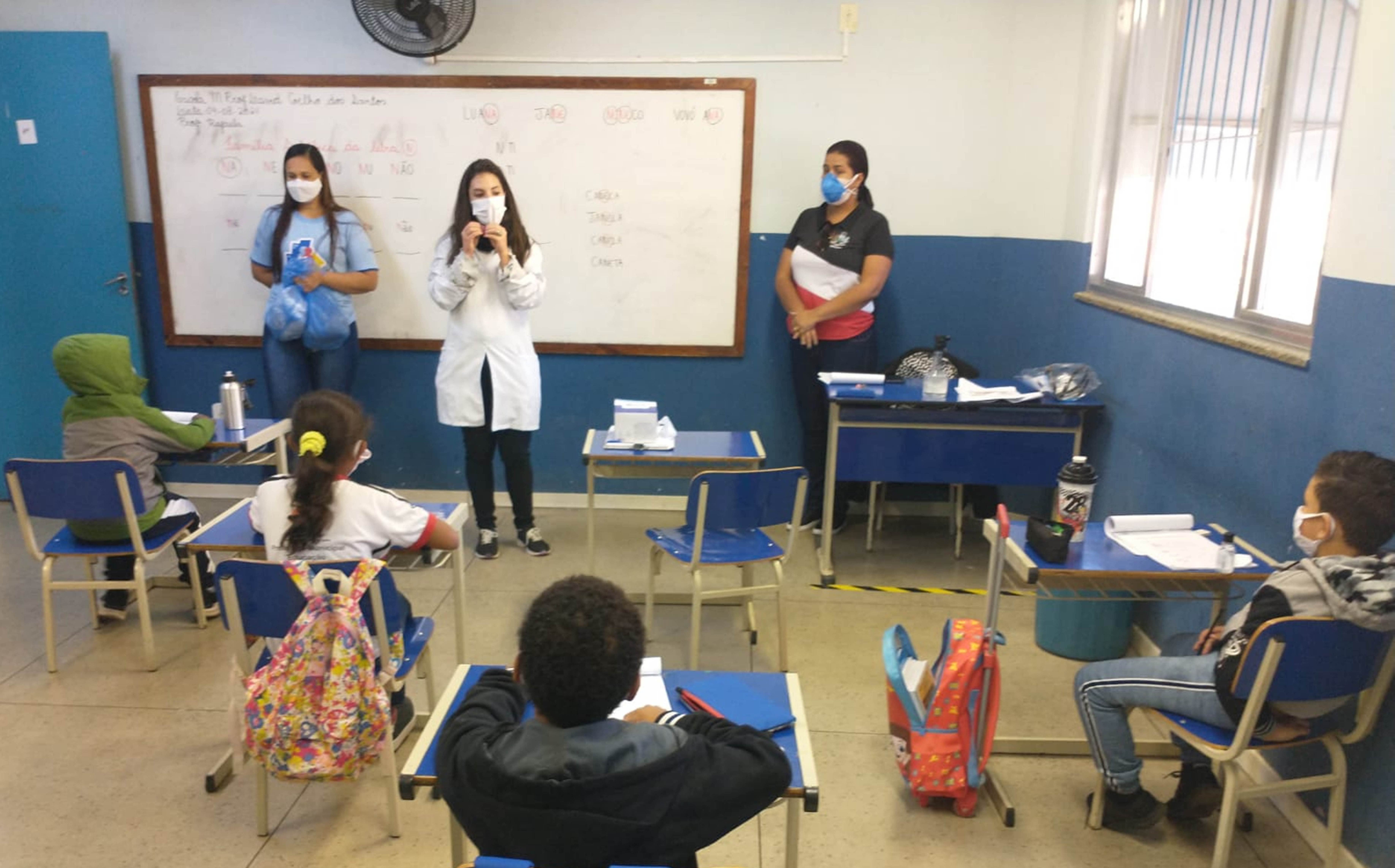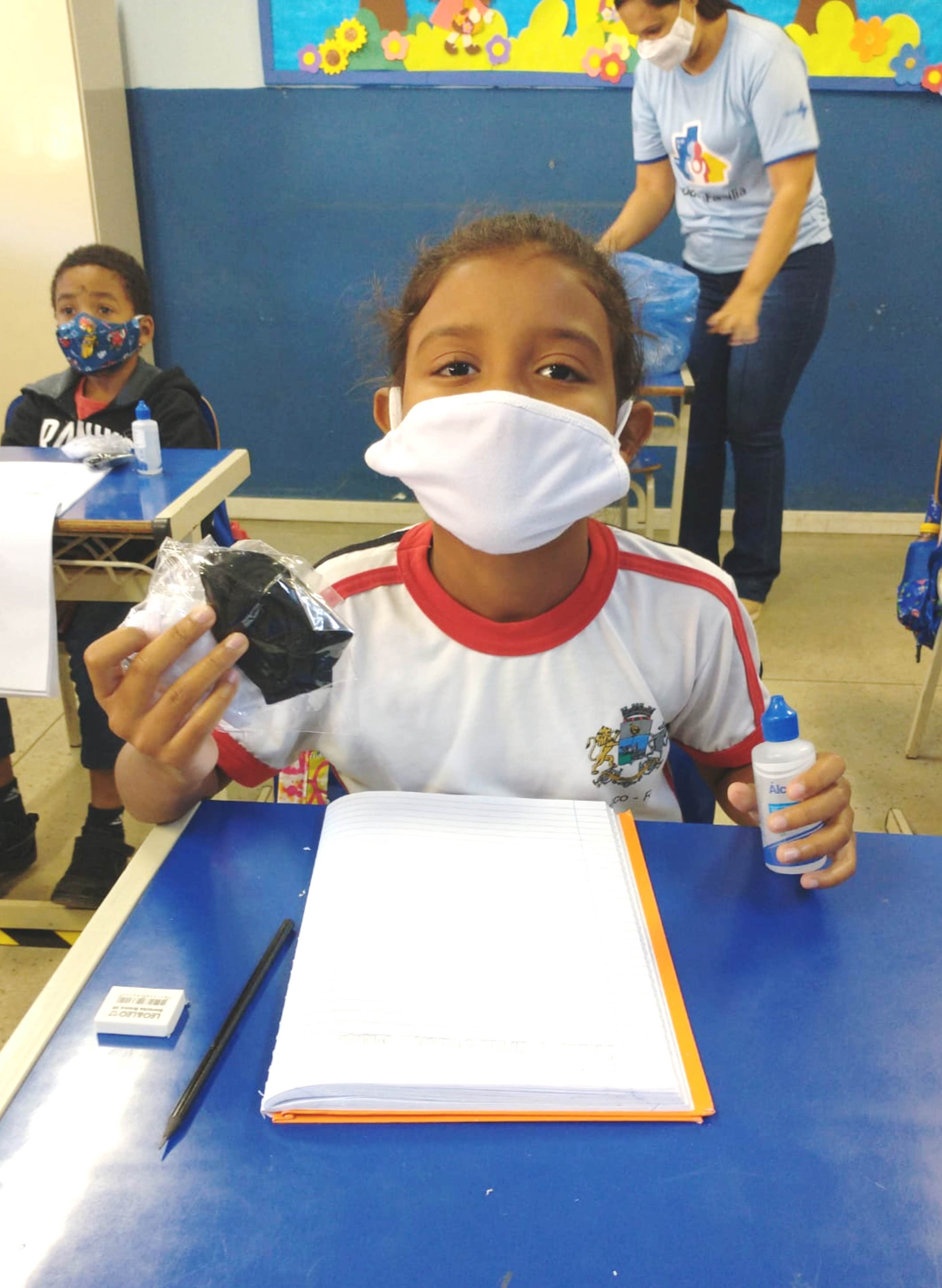 Máscaras e álcool em gel foram distribuídos aos alunos da Escola Municipal