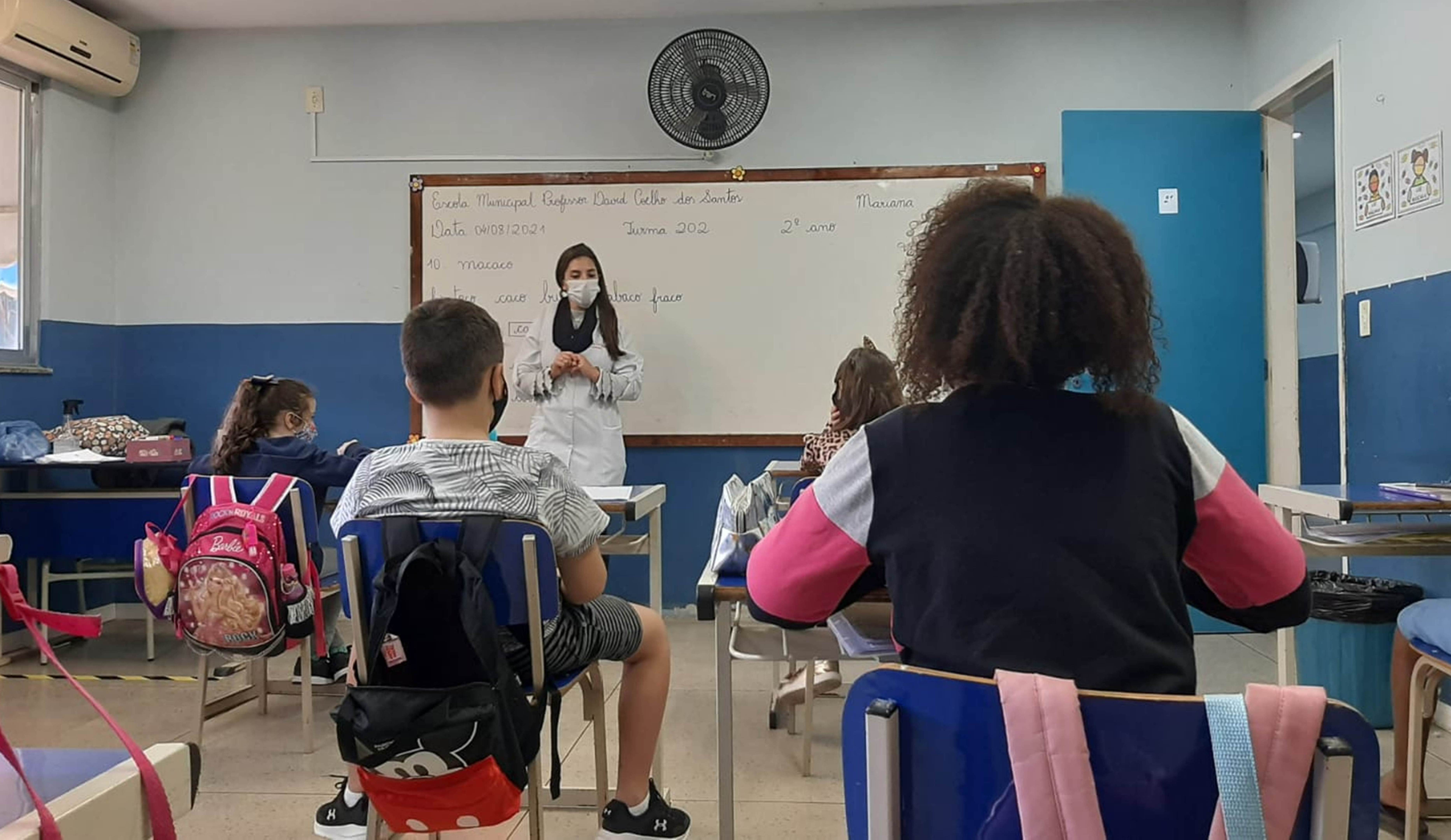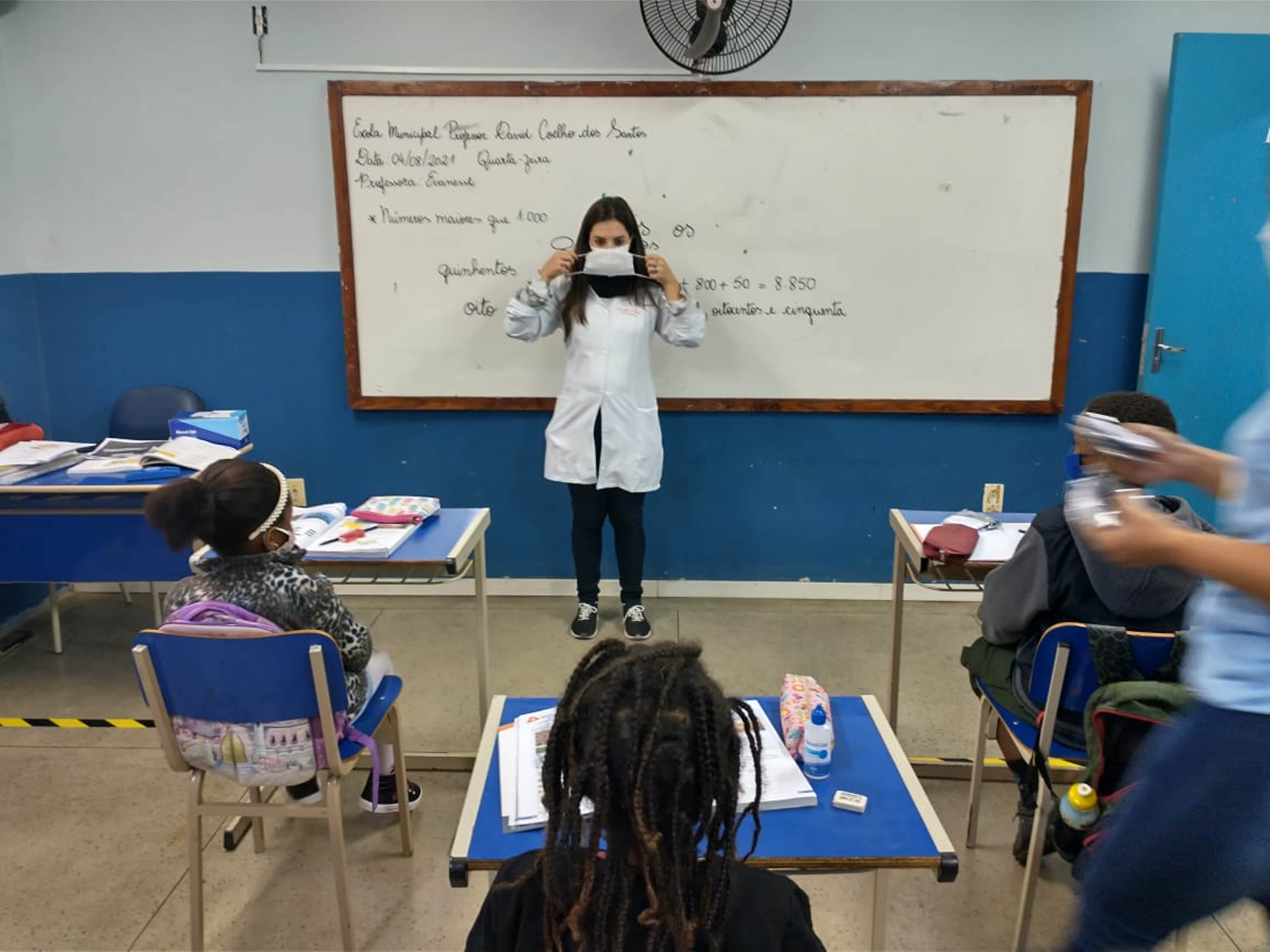 Enfermeira da Estratégia de Saúde da Barreira e coordenadora do Programa de Atenção Básica em Saúde, Anna Carolina visitou as salas de aula – ainda com turmas reduzidas pelo protocolo de segurança e sistema de ensino híbrido – para promover orientações sobre como evitar a COVID-19. Ela detalhou temas como o uso correto das máscaras e higienização periódica das mãos, distribuindo máscaras e álcool gel.