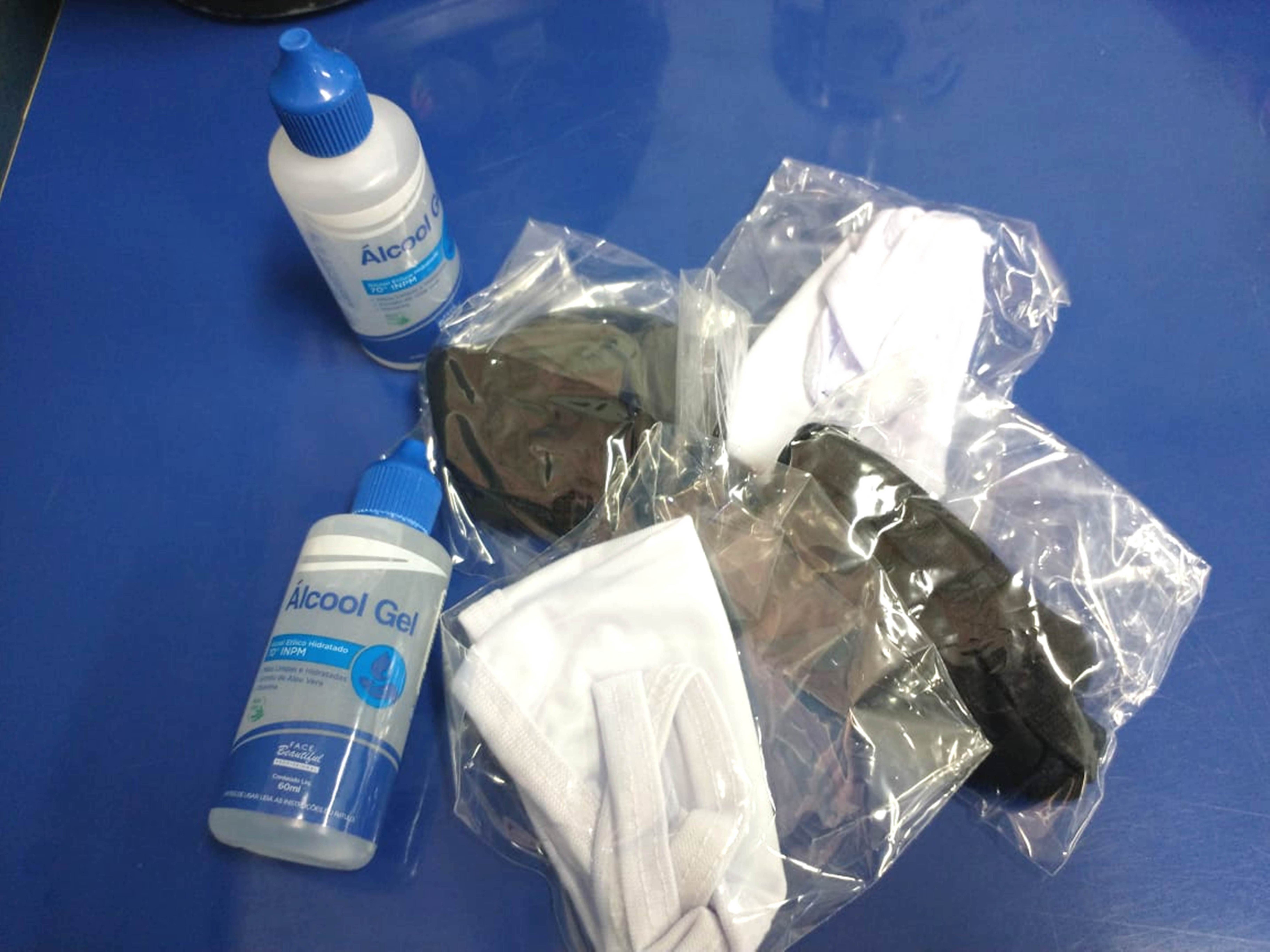 A aluna exibe as máscaras e o tubinho de álcool em gel para a sua proteção