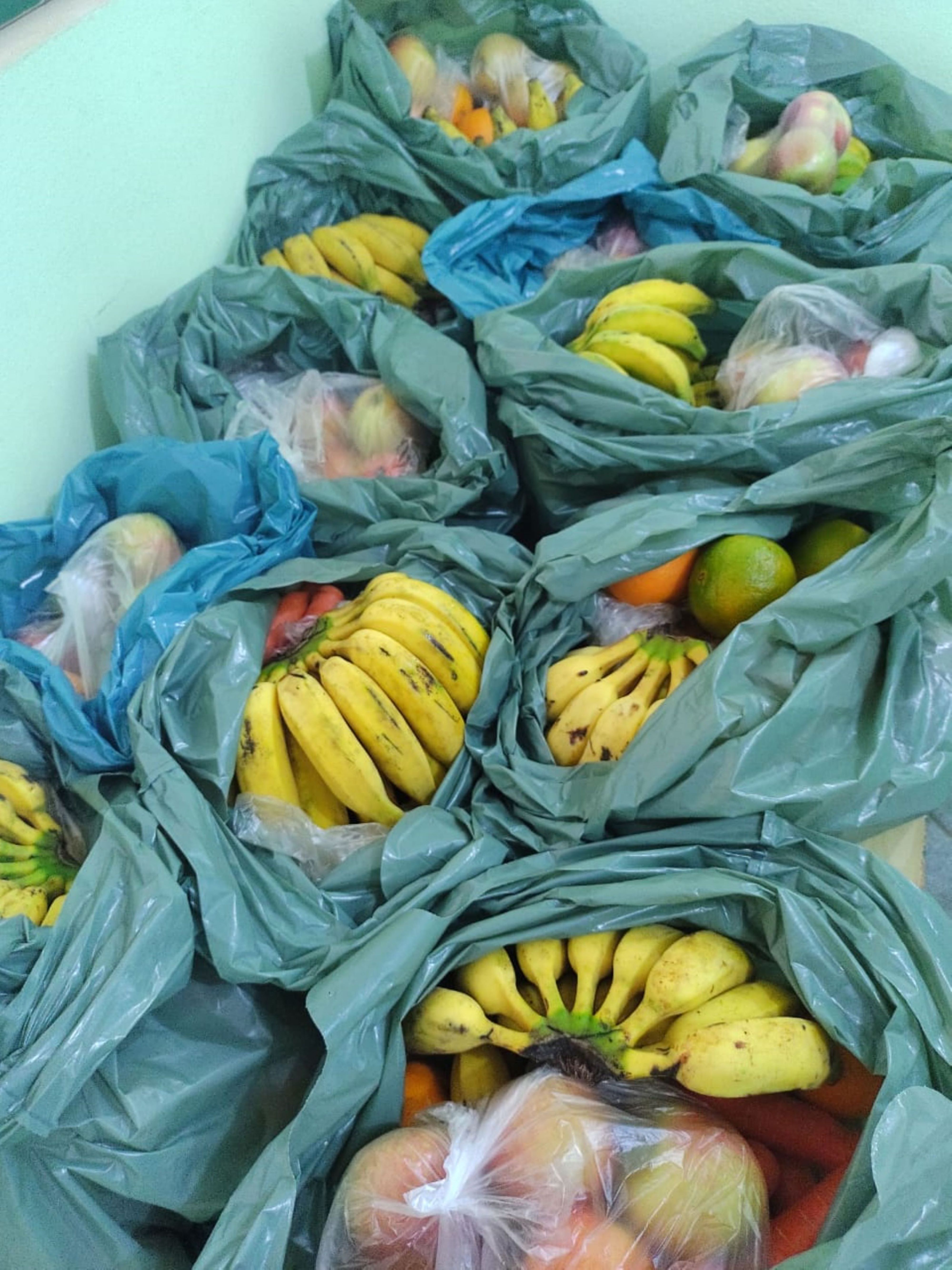 Frutas e legumes são cuidadosamente embaladas antes da entrega às famílias