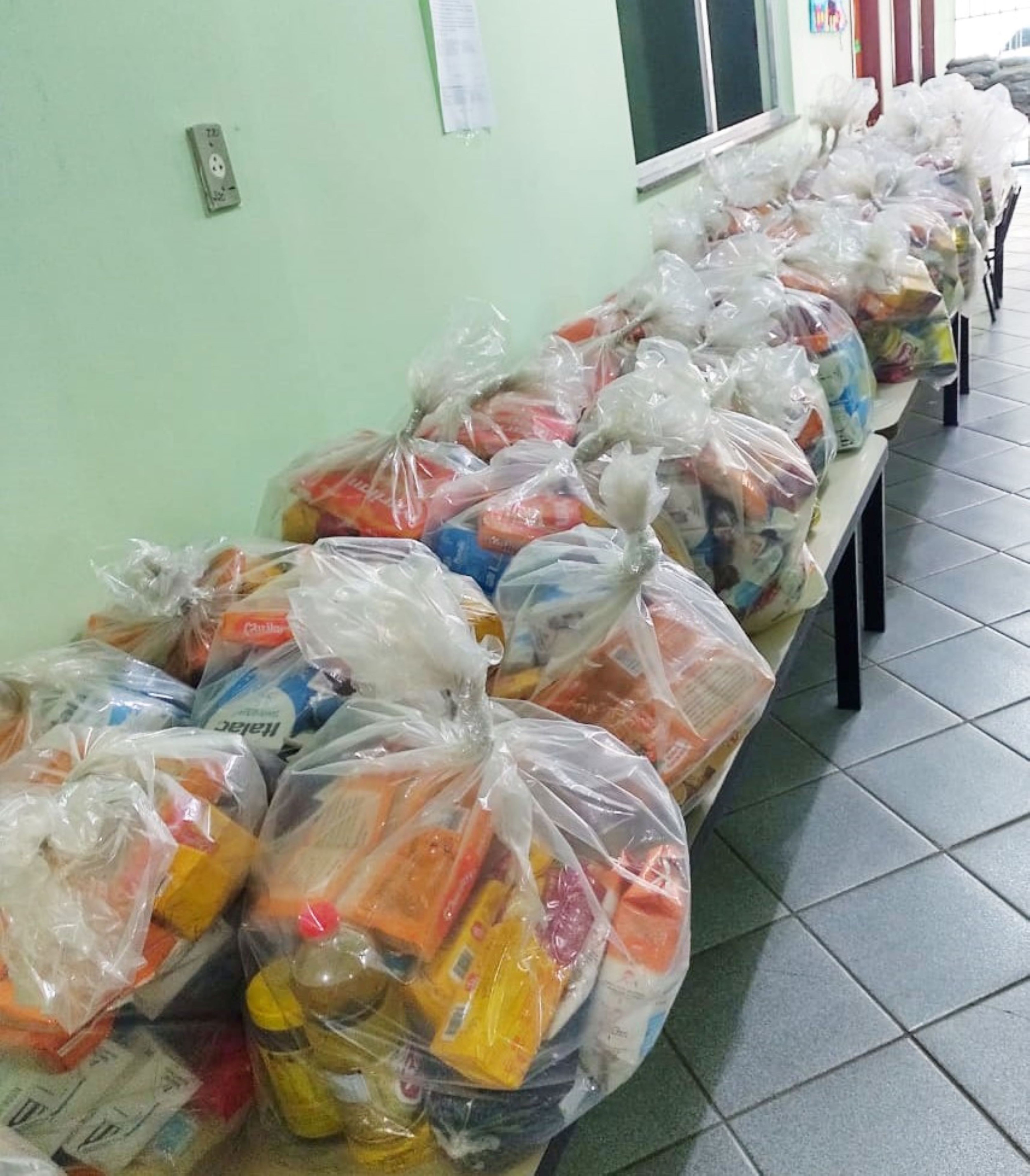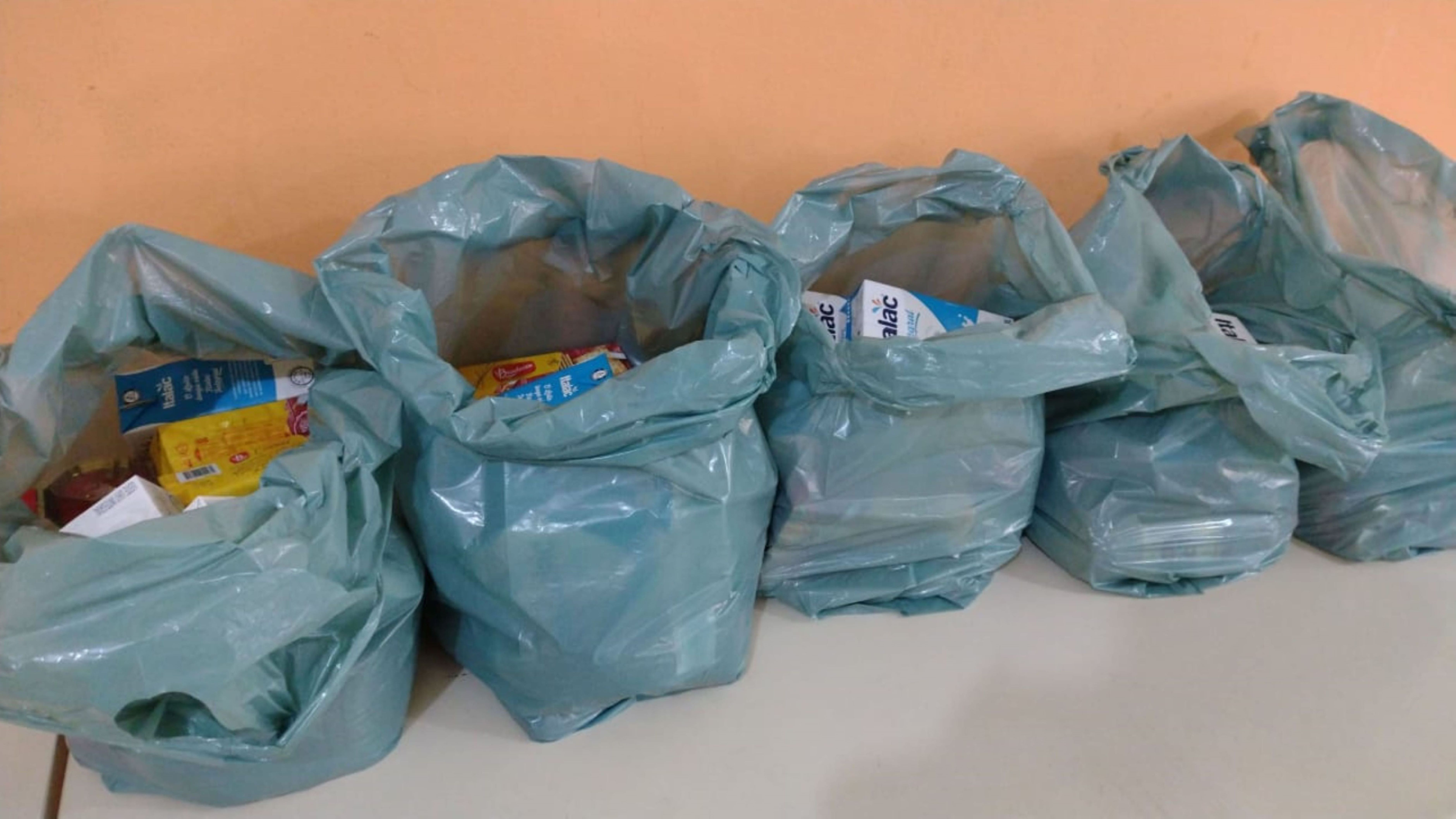 Sacolas com os produtos prontas para serem entregues a pais e responsáveis