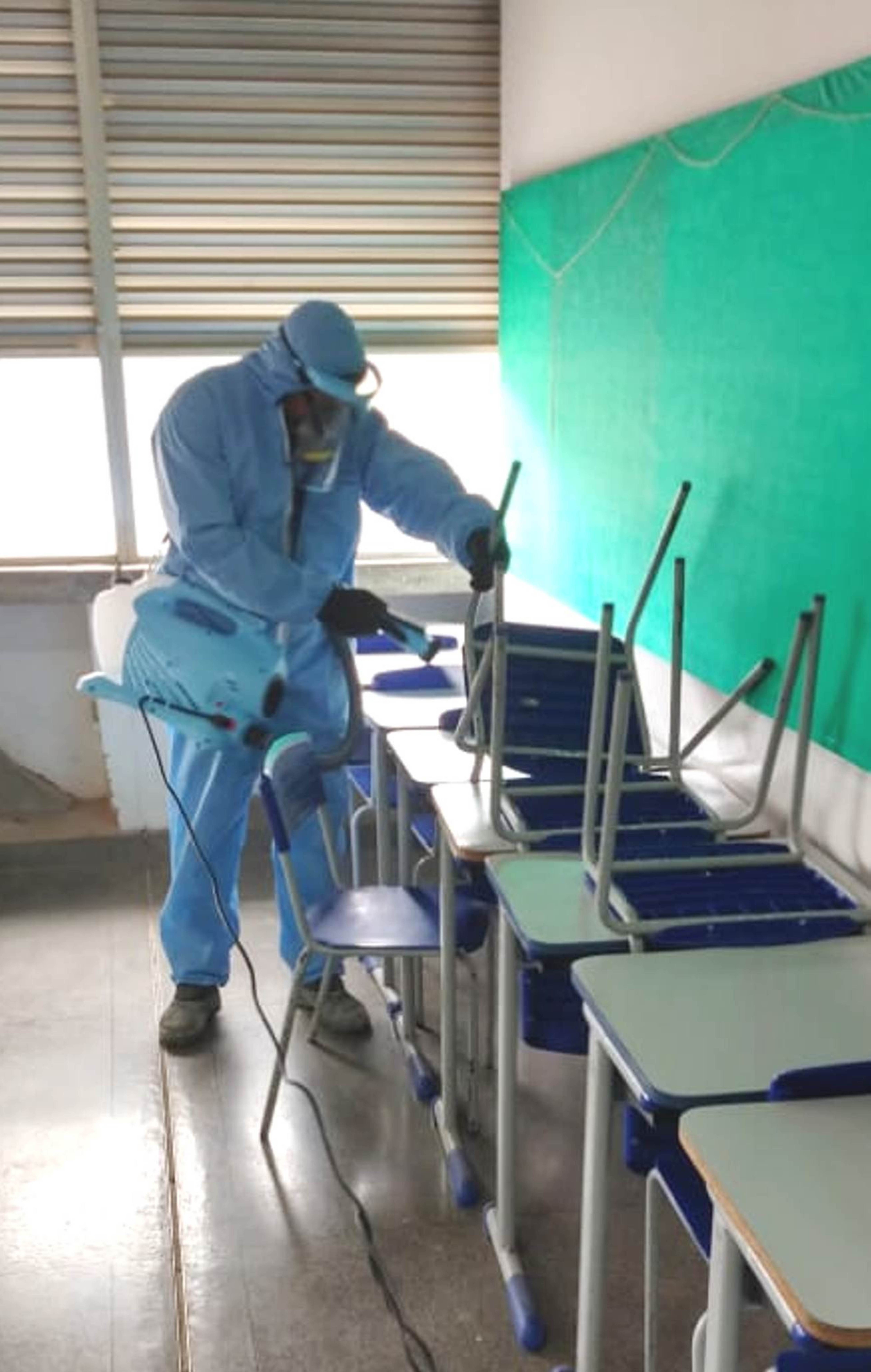 Cada carteira e cadeira das salas de aula recebeu o sanitizante durante a ação