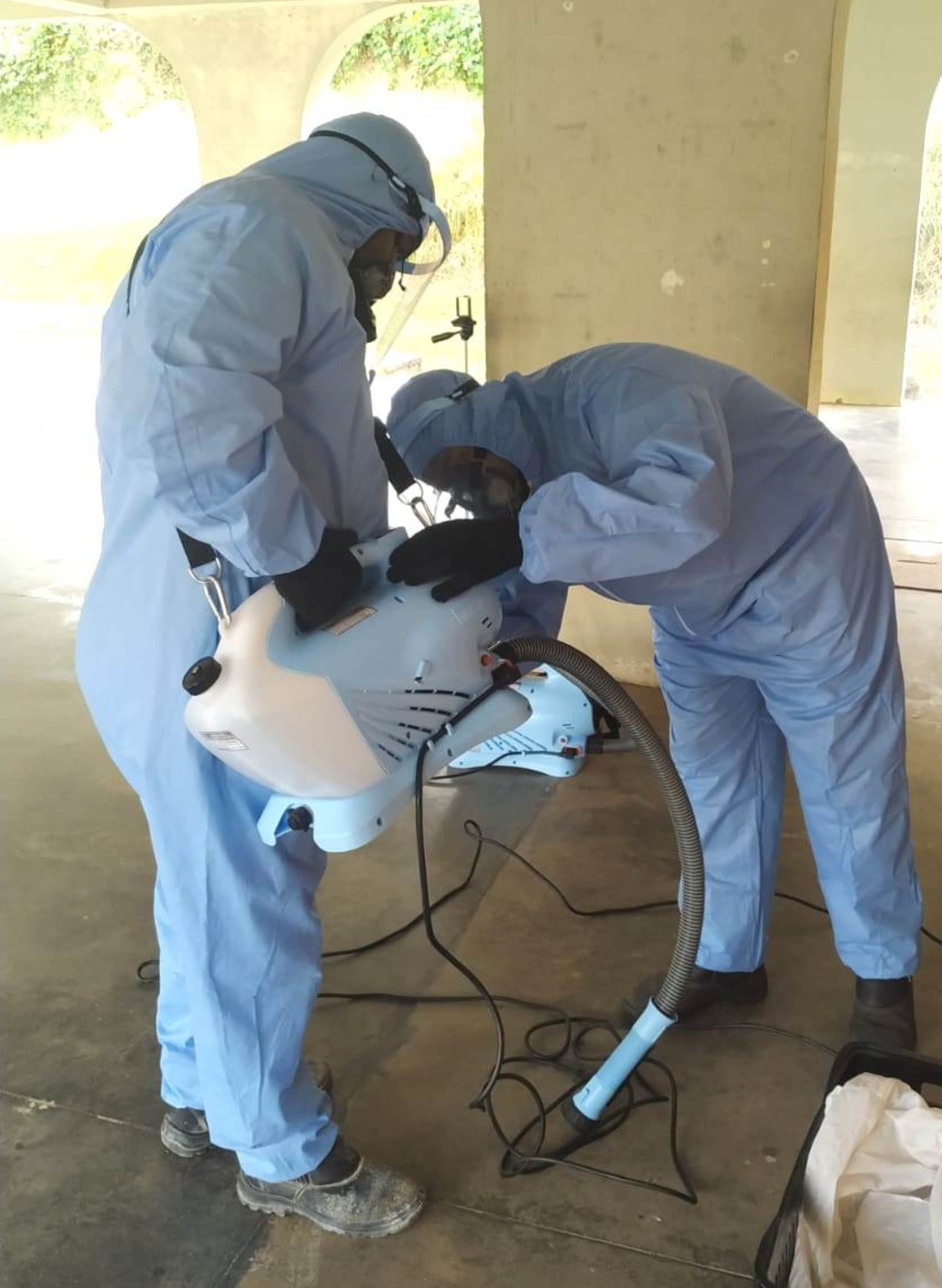 Protegidos, profissionais da firma de sanitização manuseiam o equipamento