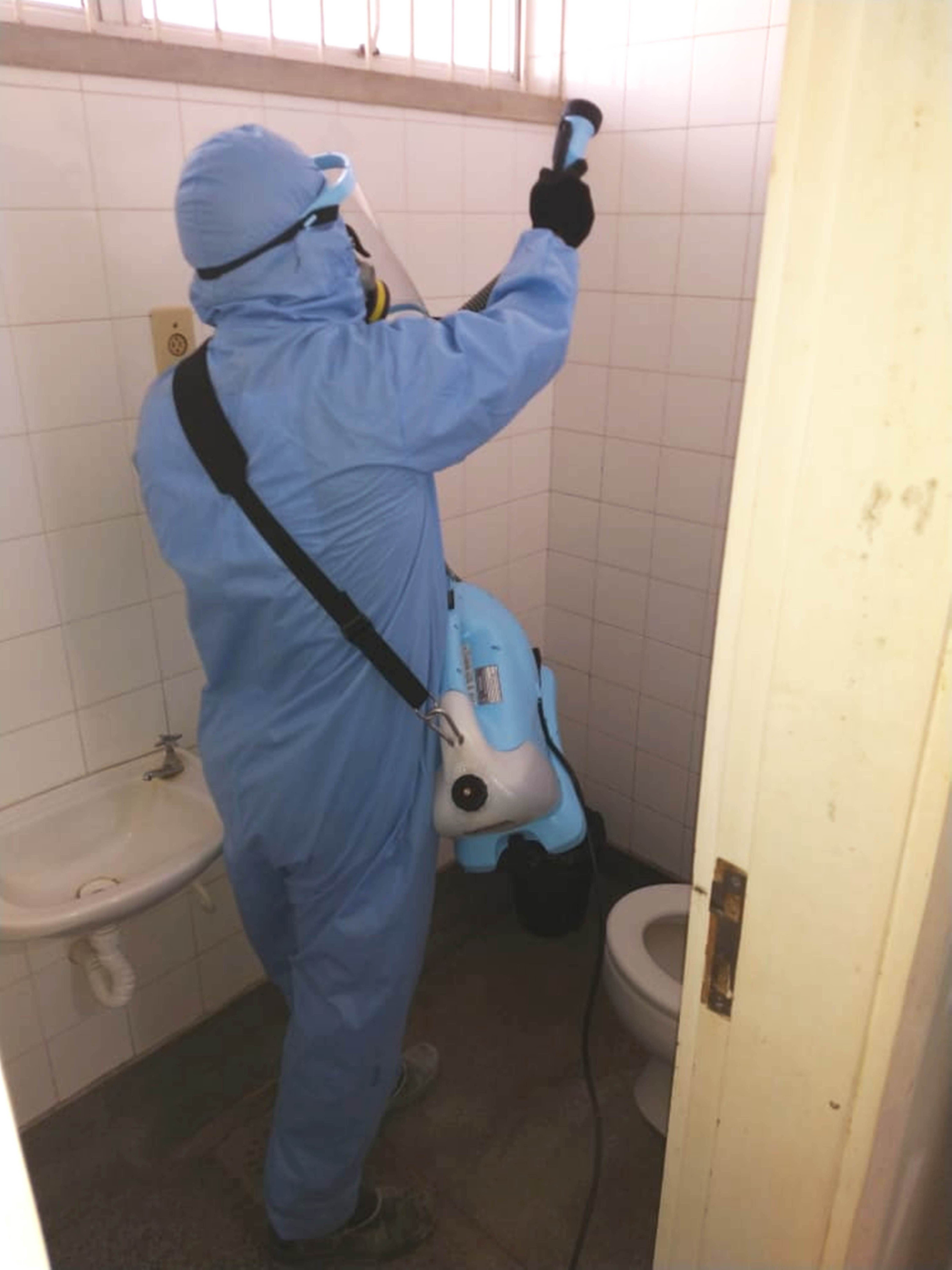 Banheiro de um dos educandários sendo limpo e desinfetado pela empresa